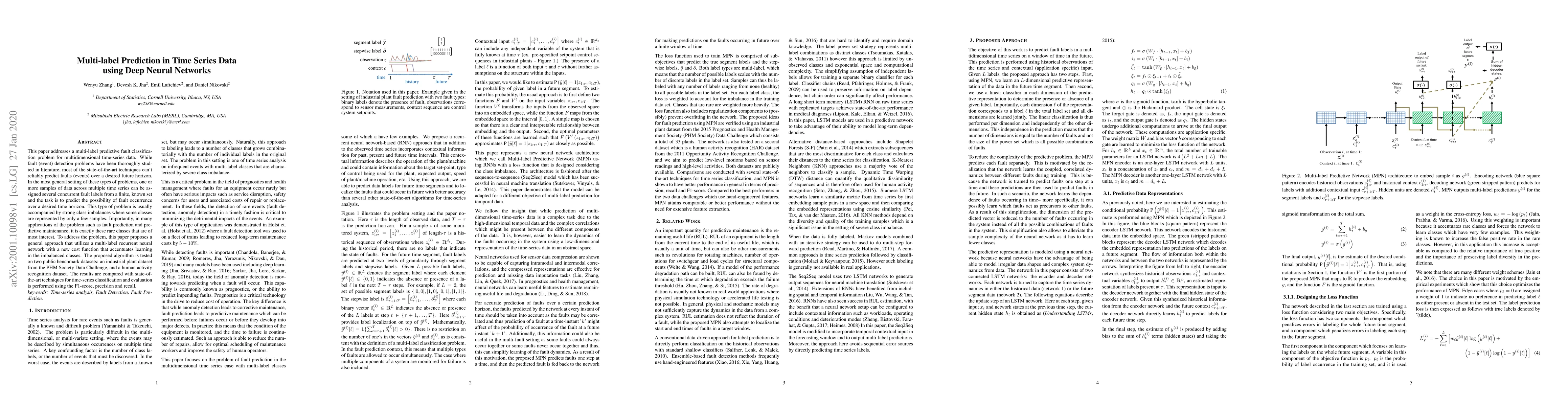 This paper addresses a multi-label predictive fault classification problem for multidimensional time-series data. While fault (event) detection problems have been thoroughly studied in literature, most of the state-of-the-art techniques can't reliably predict faults (events) over a desired future horizon. In the most general setting of these types of problems, one or more samples of data across multiple time series can be assigned several concurrent fault labels from a finite, known set and the task is to predict the possibility of fault occurrence over a desired time horizon. This type of problem is usually accompanied by strong class imbalances where some classes are represented by only a few samples. Importantly, in many applications of the problem such as fault prediction and predictive maintenance, it is exactly these rare classes that are of most interest. To address the problem, this paper proposes a general approach that utilizes a multi-label recurrent neural network with a new cost function that accentuates learning in the imbalanced classes. The proposed algorithm is tested on two public benchmark datasets: an industrial plant dataset from the PHM Society Data Challenge, and a human activity recognition dataset. The results are compared with state-of-the-art techniques for time-series classification and evaluation is performed using the F1-score, precision and recall.