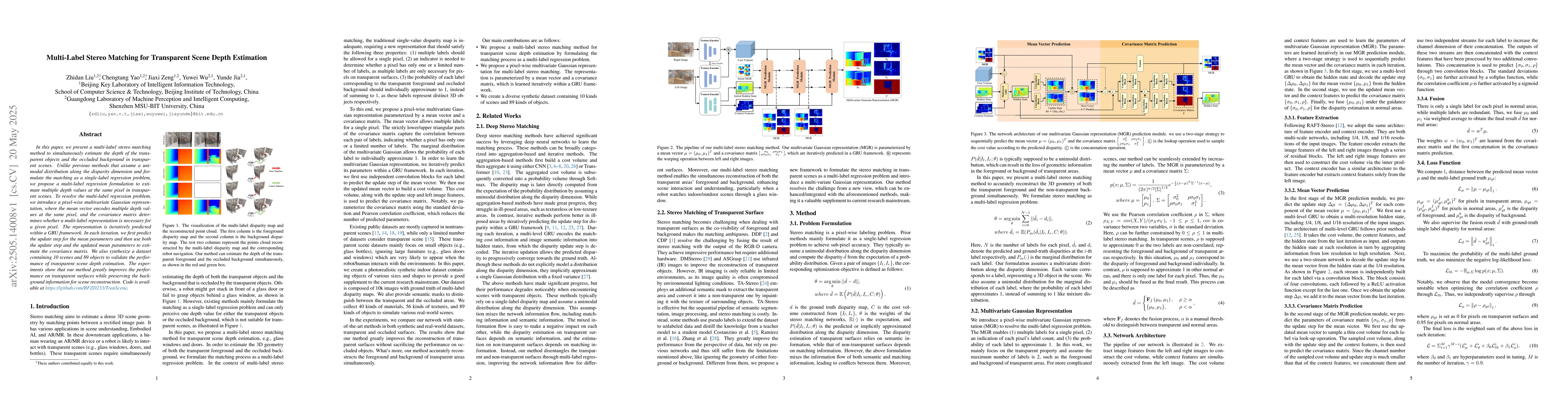 In this paper, we present a multi-label stereo matching method to simultaneously estimate the depth of the transparent objects and the occluded background in transparent scenes.Unlike previous methods that assume a unimodal distribution along the disparity dimension and formulate the matching as a single-label regression problem, we propose a multi-label regression formulation to estimate multiple depth values at the same pixel in transparent scenes. To resolve the multi-label regression problem, we introduce a pixel-wise multivariate Gaussian representation, where the mean vector encodes multiple depth values at the same pixel, and the covariance matrix determines whether a multi-label representation is necessary for a given pixel. The representation is iteratively predicted within a GRU framework. In each iteration, we first predict the update step for the mean parameters and then use both the update step and the updated mean parameters to estimate the covariance matrix. We also synthesize a dataset containing 10 scenes and 89 objects to validate the performance of transparent scene depth estimation. The experiments show that our method greatly improves the performance on transparent surfaces while preserving the background information for scene reconstruction. Code is available at https://github.com/BFZD233/TranScene.