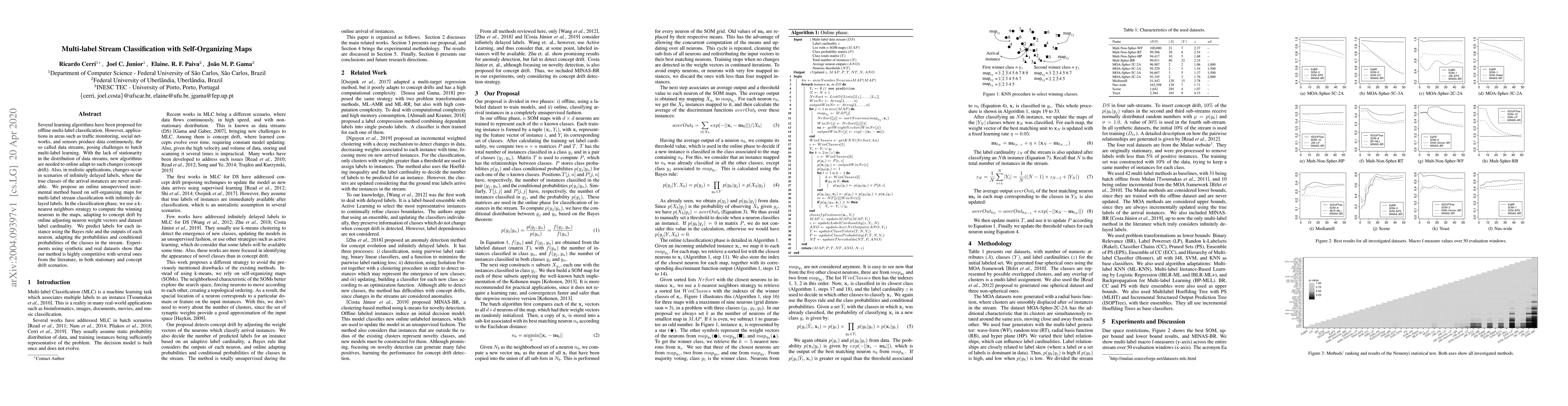 This paper proposes an online unsupervised method using self-organizing maps for multi-label classification of data streams with infinitely delayed labels, employing a k-nearest neighbors strategy and adaptive weight vectors to handle concept drift, and demonstrates competitive performance in experiments.