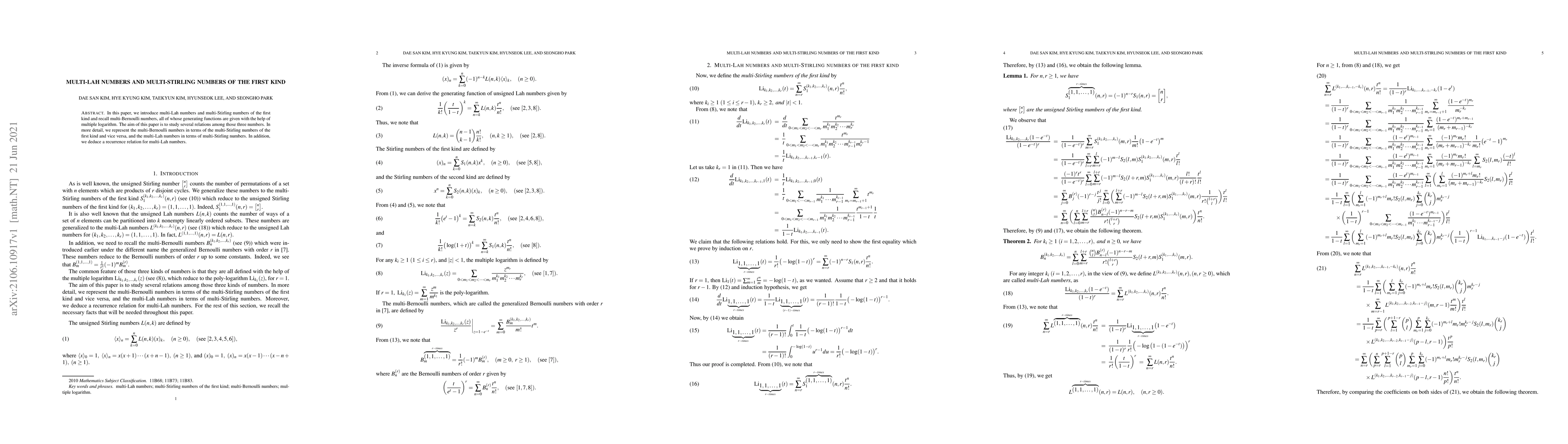 This paper introduces multi-Lah numbers, multi-Stirling numbers of the first kind, and multi-Bernoulli numbers, establishing generating functions for these numbers using multiple logarithms. The study reveals relationships between these numbers, including representations of multi-Bernoulli numbers in terms of multi-Stirling numbers and a recurrence relation for multi-Lah numbers.