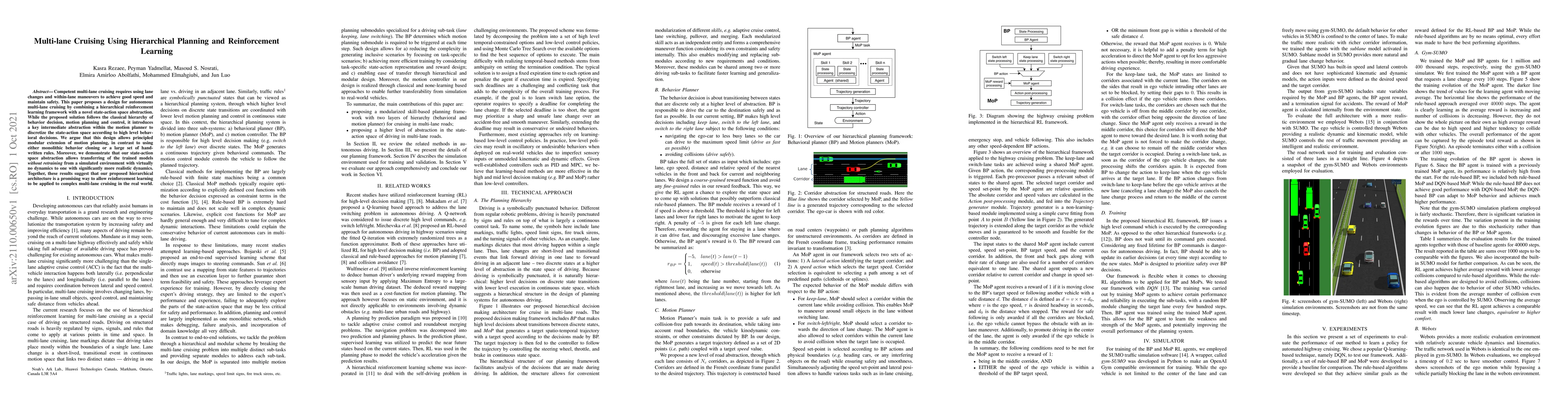 This paper presents a hierarchical reinforcement learning framework for autonomous multi-lane cruising, utilizing a novel state-action space abstraction to facilitate modular motion planning and transferability from simulation to real-world environments. The proposed architecture shows promise for complex driving behaviors in realistic settings.
