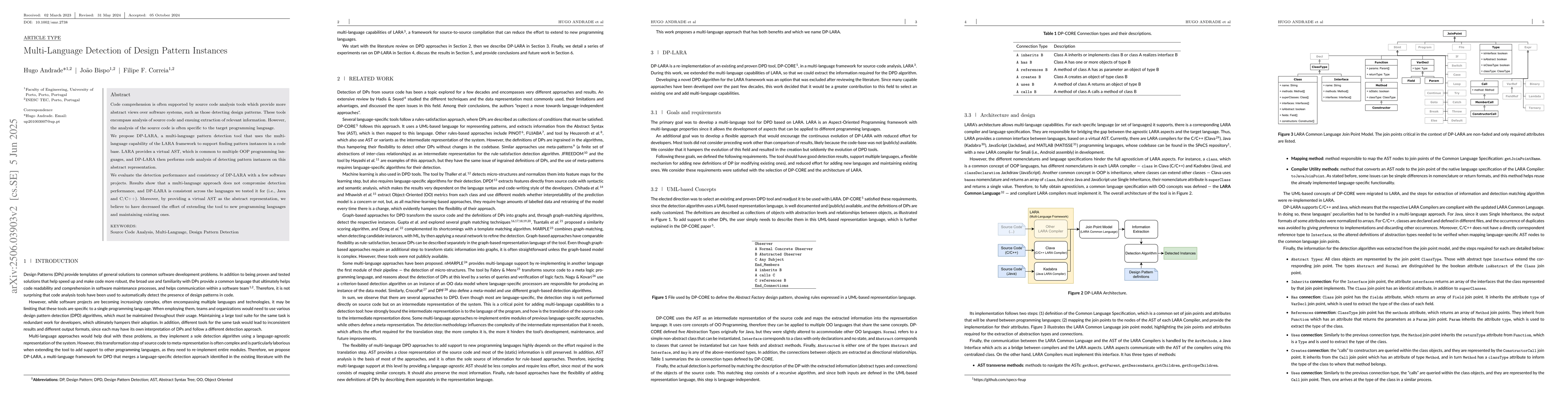 DP-LARA, a multi-language design pattern detection tool leveraging the LARA framework's virtual AST for consistent and performant analysis across multiple OOP languages.