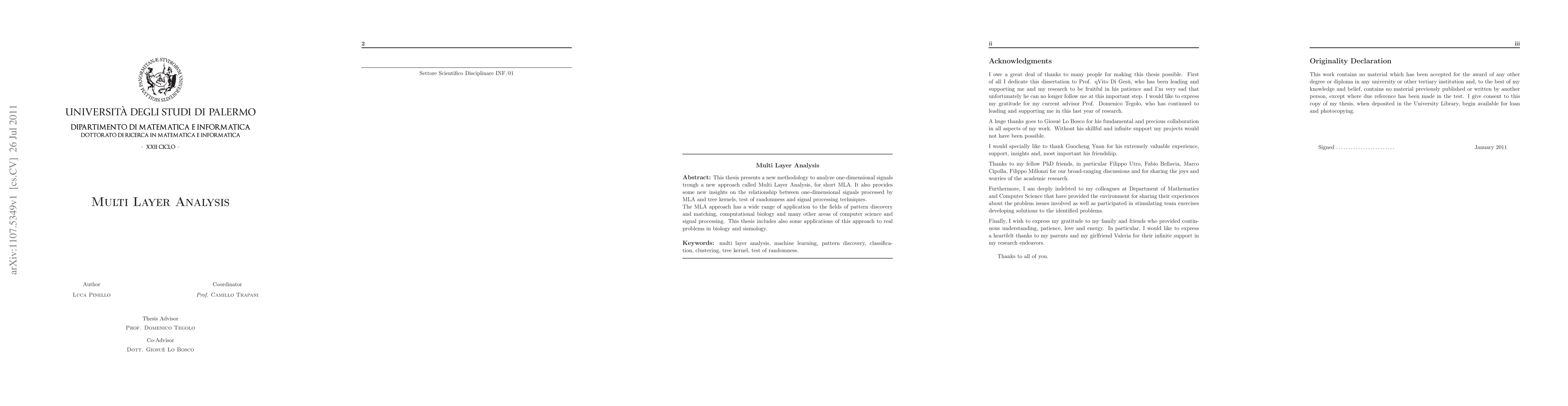 This thesis presents a new methodology to analyze one-dimensional signals trough a new approach called Multi Layer Analysis, for short MLA. It also provides some new insights on the relationship between one-dimensional signals processed by MLA and tree kernels, test of randomness and signal processing techniques. The MLA approach has a wide range of application to the fields of pattern discovery and matching, computational biology and many other areas of computer science and signal processing. This thesis includes also some applications of this approach to real problems in biology and seismology.