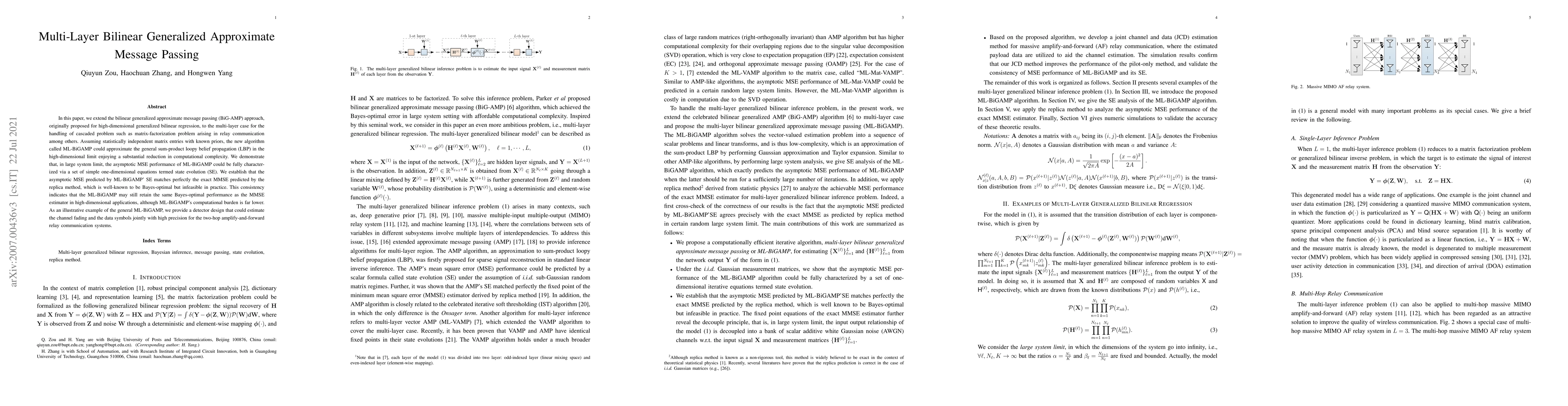 The development of the multi-layer bilinear generalized approximate message passing (ML-BiGAMP) algorithm and its analysis through state evolution (SE) to approximate the MMSE performance in high-dimensional limit.