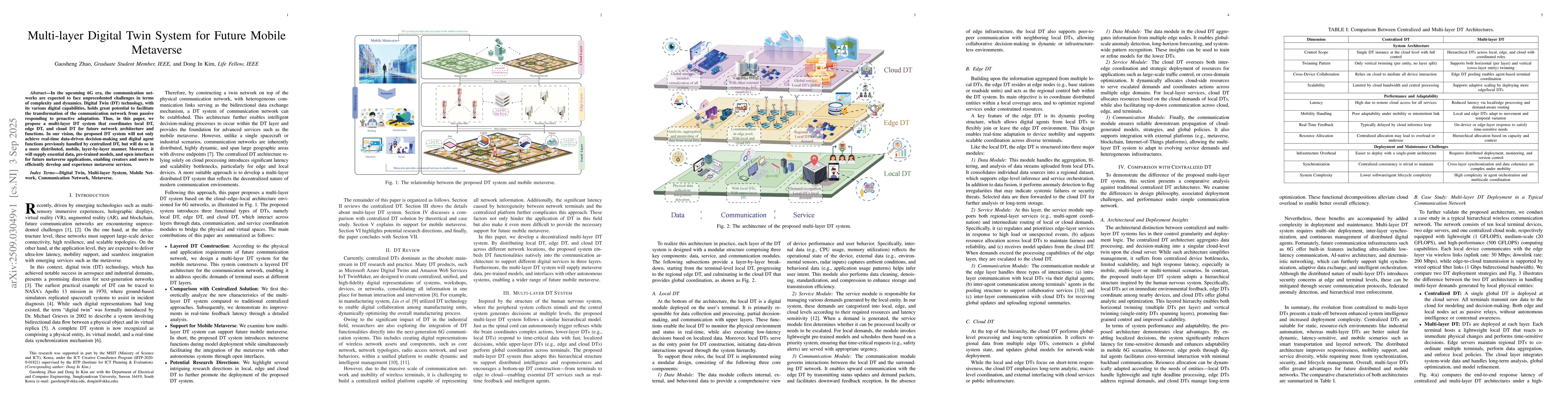 In the upcoming 6G era, the communication networks are expected to face unprecedented challenges in terms of complexity and dynamics. Digital Twin (DT) technology, with its various digital capabilities, holds great potential to facilitate the transformation of the communication network from passive responding to proactive adaptation. Thus, in this paper, we propose a multi-layer DT system that coordinates local DT, edge DT, and cloud DT for future network architecture and functions. In our vision, the proposed DT system will not only achieve real-time data-driven decision-making and digital agent functions previously handled by centralized DT, but will do so in a more distributed, mobile, layer-by-layer manner. Moreover, it will supply essential data, pre-trained models, and open interfaces for future metaverse applications, enabling creators and users to efficiently develop and experience metaverse services.