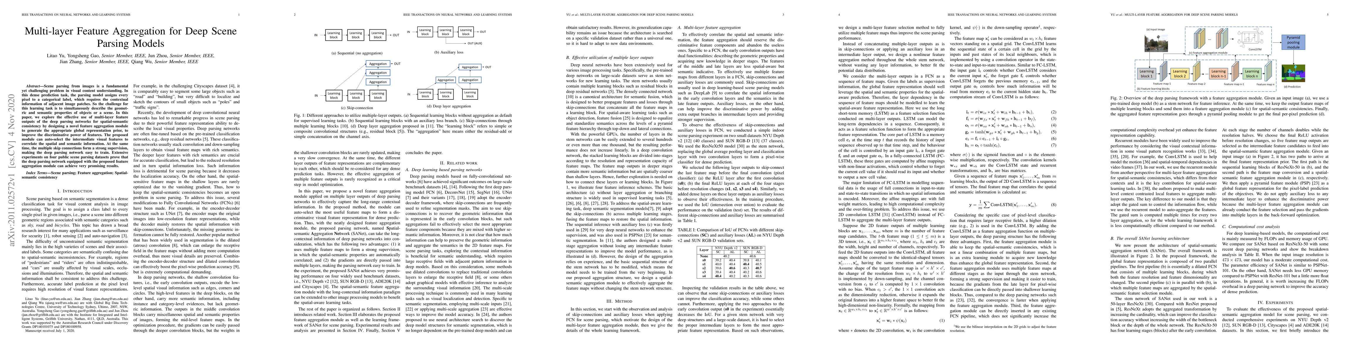 This paper introduces a novel feature aggregation module to enhance deep scene parsing models by utilizing multi-layer feature outputs for spatial-semantic consistency. The module auto-selects intermediate visual features to correlate spatial and semantic information, supported by multiple skip connections, leading to improved discriminative power and promising results on four public datasets.
