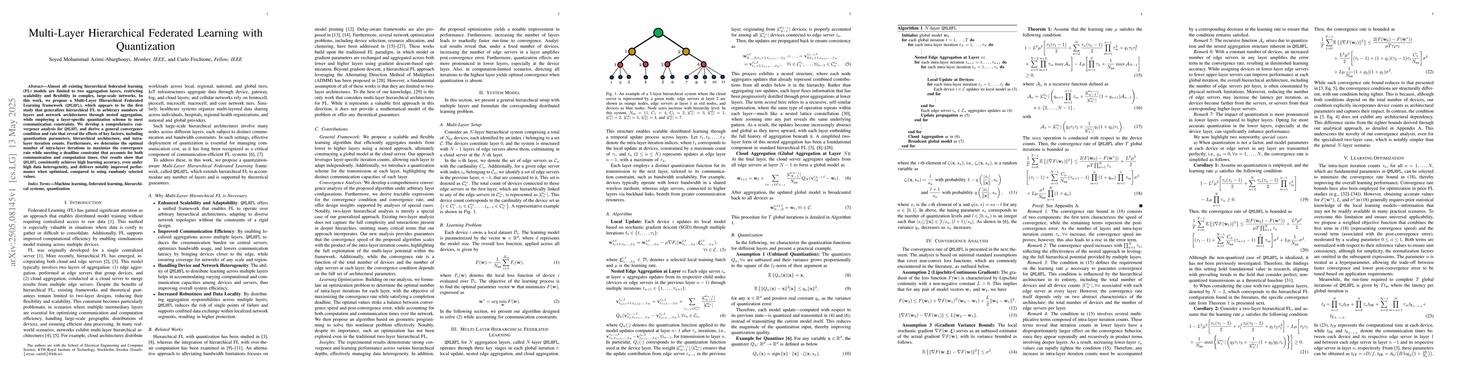 The research proposes a Multi-Layer Hierarchical Federated Learning framework (QMLHFL) that generalizes hierarchical FL to arbitrary numbers of layers and network architectures via nested aggregation, incorporating layer-specific quantization to address communication constraints.