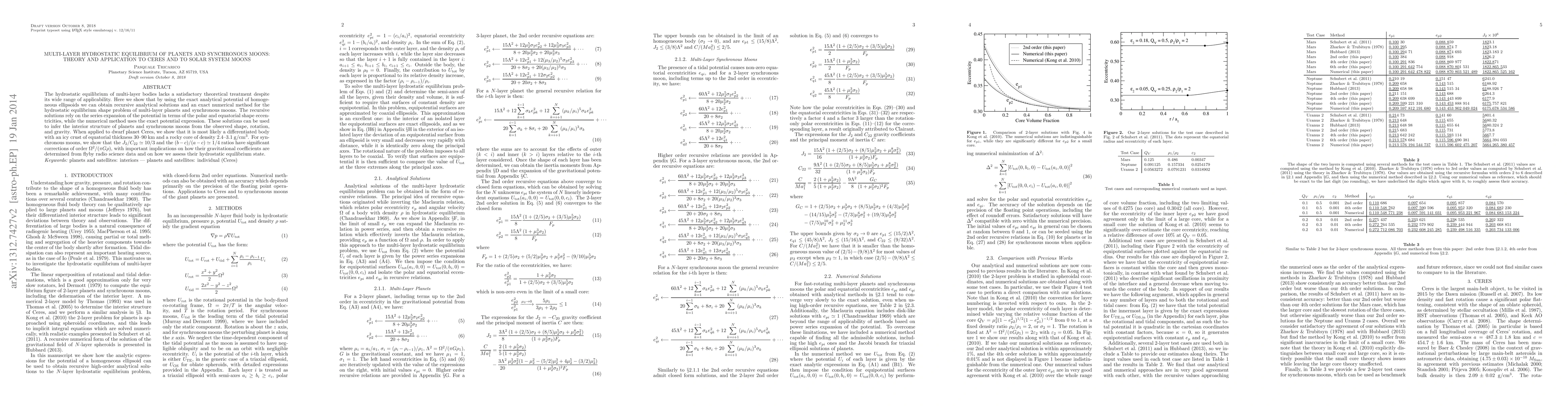 The hydrostatic equilibrium of multi-layer bodies lacks a satisfactory theoretical treatment despite its wide range of applicability. Here we show that by using the exact analytical potential of homogeneous ellipsoids we can obtain recursive analytical solutions and an exact numerical method for the hydrostatic equilibrium shape problem of multi-layer planets and synchronous moons. The recursive solutions rely on the series expansion of the potential in terms of the polar and equatorial shape eccentricities, while the numerical method uses the exact potential expression. These solutions can be used to infer the interior structure of planets and synchronous moons from the observed shape, rotation, and gravity. When applied to dwarf planet Ceres, we show that it is most likely a differentiated body with an icy crust of equatorial thickness 30-90 km and a rocky core of density 2.4-3.1 g/cm$^3$. For synchronous moons, we show that the $J_2/C_{22} \simeq 10/3$ and the $(b-c)/(a-c) \simeq 1/4$ ratios have significant corrections of order $\Omega^2/(\pi G \rho)$, with important implications on how their gravitational coefficients are determined from flyby radio science data and on how we assess their hydrostatic equilibrium state.