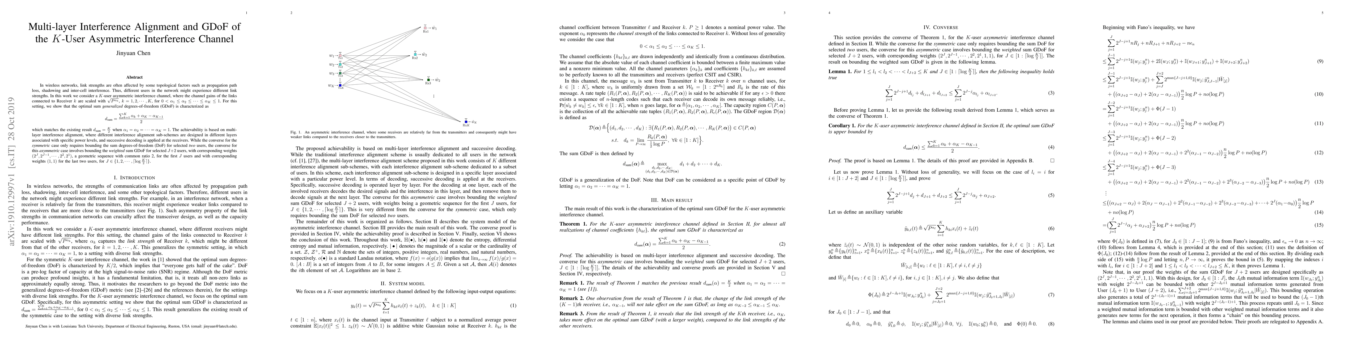 In wireless networks, link strengths are often affected by some topological factors such as propagation path loss, shadowing and inter-cell interference. Thus, different users in the network might experience different link strengths. In this work we consider a K-user asymmetric interference channel, where the channel gains of the links connected to Receiver k are scaled with P^{\alpha_k /2}}, k=1,2,...,K, for 0< \alpha_1 \leq \alpha_2 \leq \cdots \leq \alpha_K \leq 1. For this setting, we show that the optimal sum generalized degrees-of-freedom (GDoF) is characterized as dsum = (\sum_{k=1}^K \alpha_k + \alpha_K -\alpha_{K-1})/2, which matches the existing result dsum= K/2 when \alpha_1 = \alpha_2 = ... = \alpha_K =1. The achievability is based on multi-layer interference alignment, where different interference alignment sub-schemes are designed in different layers associated with specific power levels, and successive decoding is applied at the receivers. While the converse for the symmetric case only requires bounding the sum degrees-of-freedom (DoF) for selected two users, the converse for this asymmetric case involves bounding the weighted sum GDoF for selected J+2 users, with corresponding weights (2^{J}, 2^{J-1}, ... , 2^{2}, 2^{1}), a geometric sequence with common ratio 2, for the first J users and with corresponding weights (1, 1) for the last two users, for J \in {1,2, ... , \lceil\log (K/2)\rceil }.