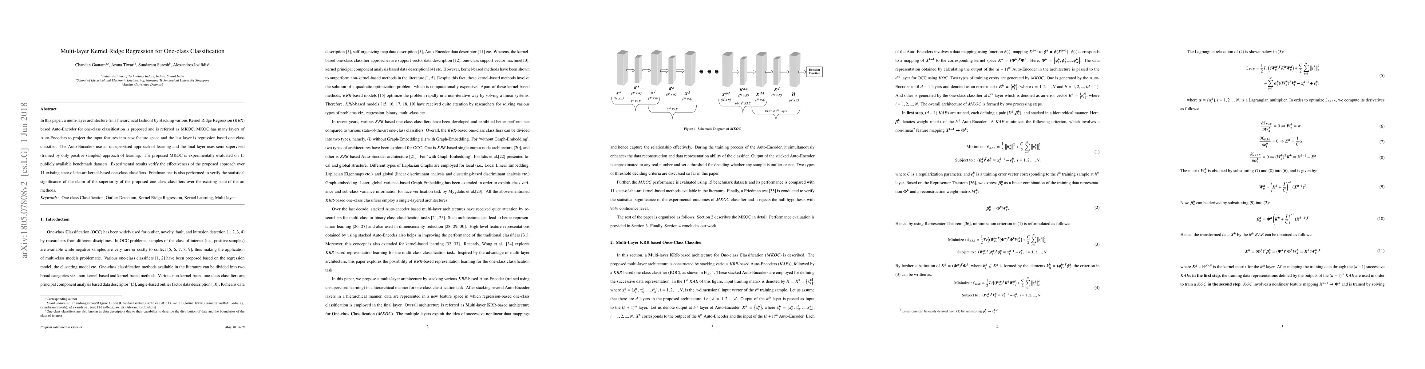 This paper proposes MKOC, a multi-layer Kernel Ridge Regression-based Auto-Encoder architecture for one-class classification, which stacks unsupervised Auto-Encoders followed by a semi-supervised regression classifier. Experimental results on 15 datasets show its superior performance over 11 state-of-the-art methods, verified by Friedman test.