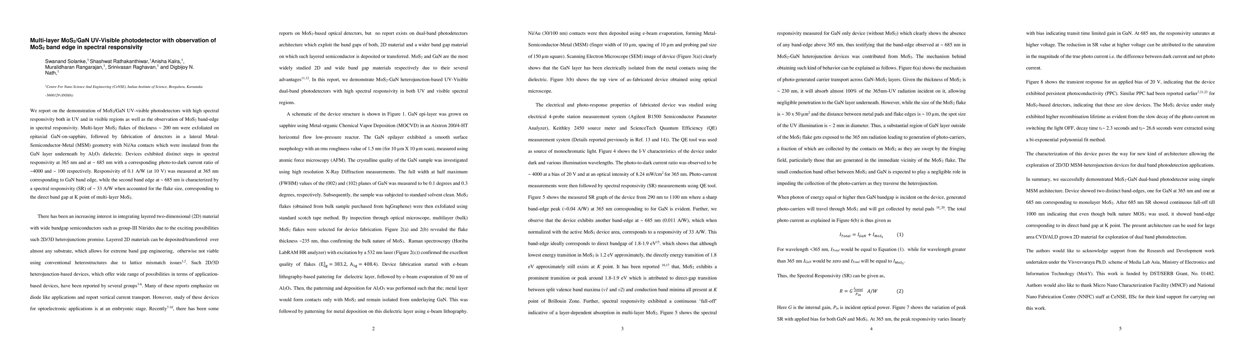 This paper demonstrates MoS2/GaN UV-visible photodetectors with high spectral responsivity, showing distinct steps at 365 nm and ~685 nm. The devices exhibit a responsivity of 0.1 A/W at 365 nm and ~33 A/W at ~685 nm, corresponding to the MoS2 band edge.