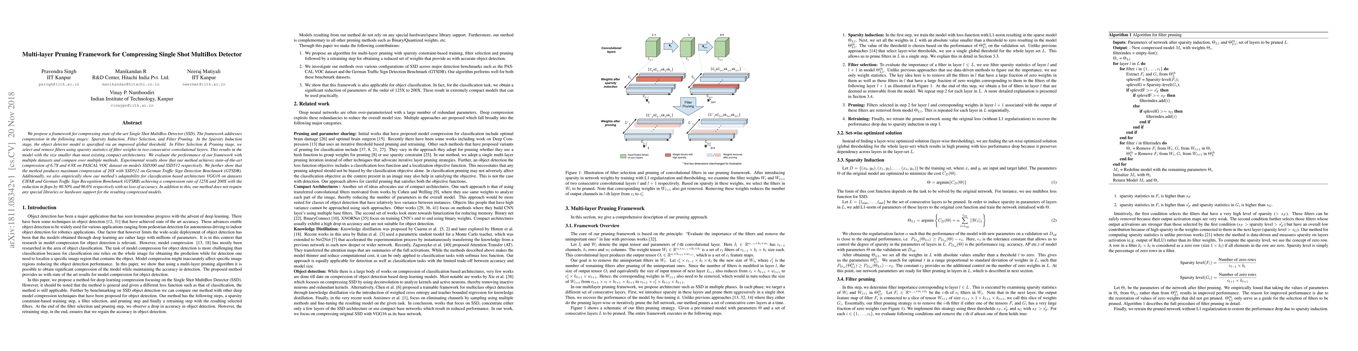 This paper proposes a multi-layer pruning framework for compressing the Single Shot MultiBox Detector (SSD) model, achieving state-of-the-art compression rates of 6.7X and 4.9X on the PASCAL VOC dataset for SSD300 and SSD512 respectively. The method also demonstrates significant compression for VGG16 on CIFAR and GTSRB datasets, achieving up to 26X compression with no loss in accuracy.