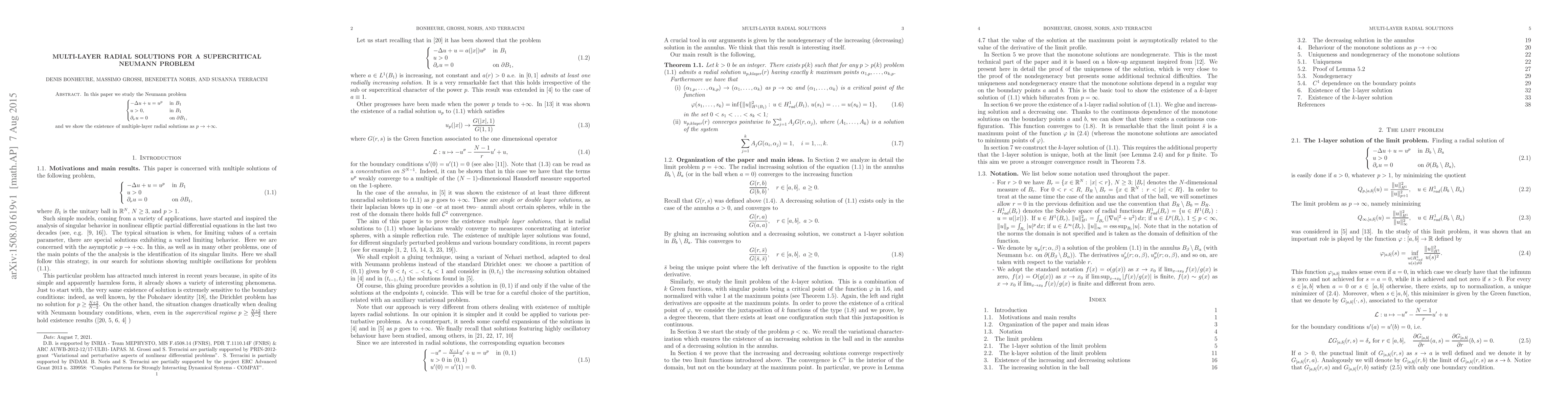In this paper we study the Neumann problem\begin{equation*}\begin{cases}-\Delta u+u=u^p \& \text{ in }B\_1 \\u \textgreater{} 0, \& \text{ in }B\_1 \\\partial\_\nu u=0 \& \text{ on } \partial B\_1,\end{cases}\end{equation*}and we show the existence of multiple-layer radial solutions as $p\rightarrow+\infty$.