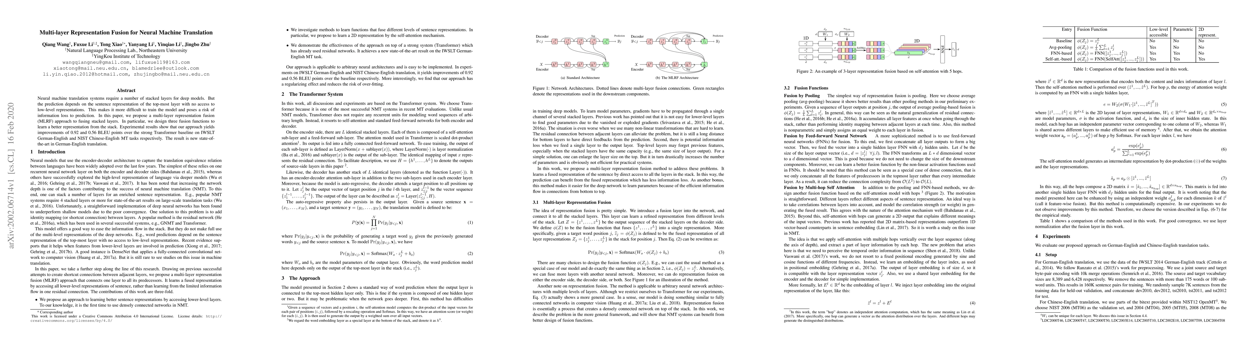 This paper proposes a multi-layer representation fusion (MLRF) approach to enhance neural machine translation by integrating information from multiple layers. The MLRF method achieves better representations through three fusion functions, resulting in improved BLEU scores and setting a new state-of-the-art in German-English translation.