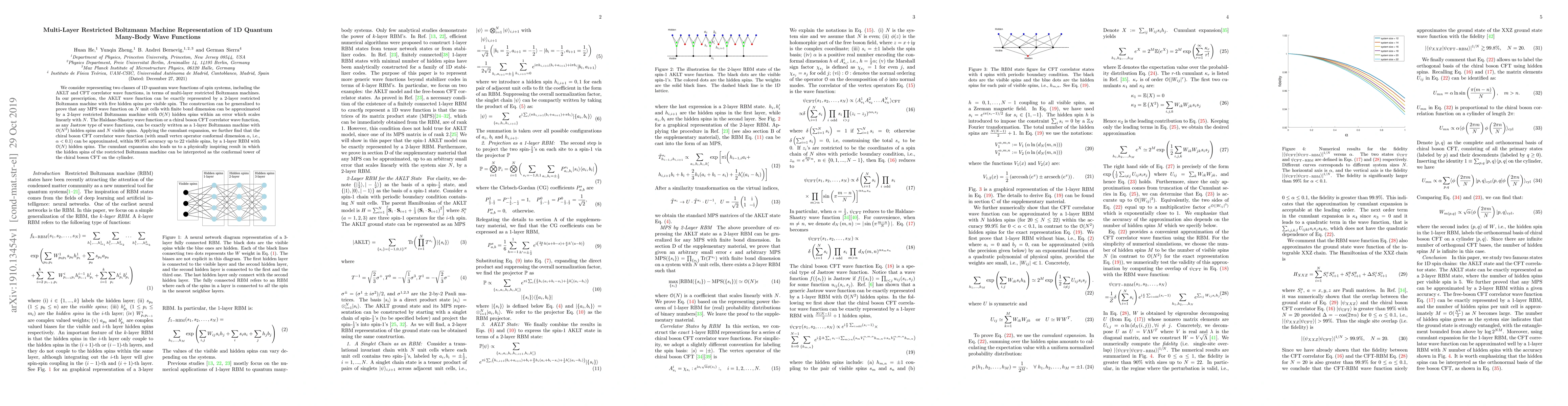 This paper proposes using multi-layer restricted Boltzmann machines to represent 1D quantum many-body wave functions, showing exact representations for AKLT and Haldane-Shastry wave functions, and demonstrating that MPS wave functions can be approximated with linear error scaling. The cumulant expansion reveals a 1-layer RBM with $\mathcal{O}(N)$ hidden spins can approximate chiral boson CFT correlator wave functions with high accuracy.