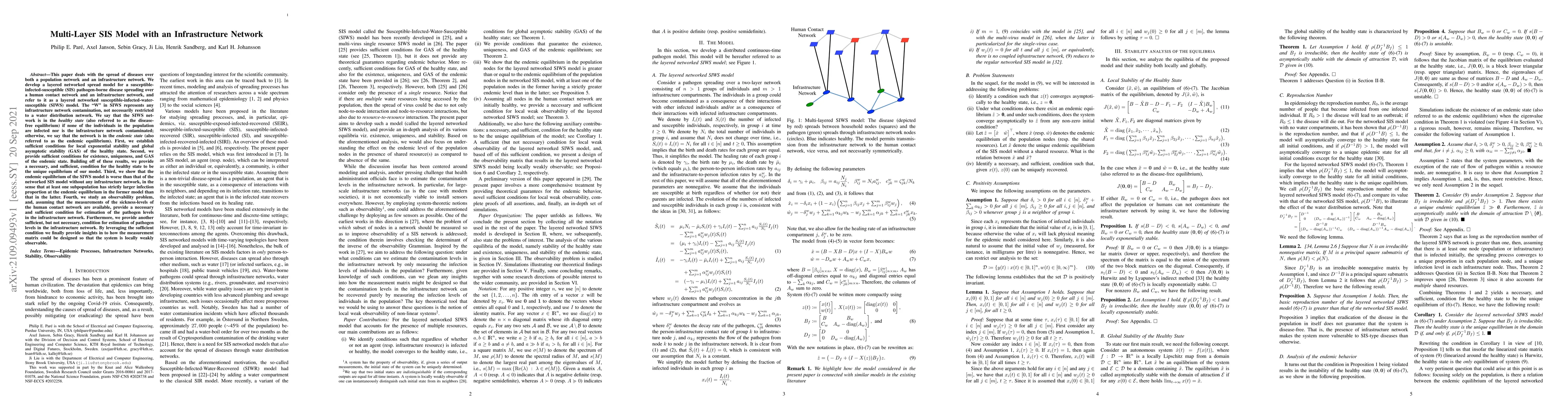 This paper deals with the spread of diseases over both a population network and an infrastructure network. We develop a layered networked spread model for a susceptible-infected-susceptible (SIS) pathogen-borne disease spreading over a human contact network and an infrastructure network, and refer to it as a layered networked susceptible-infected-water-susceptible (SIWS) model. The SIWS network is in the healthy state (also referred to as the disease-free equilibrium) if none of the individuals in the population are infected nor is the infrastructure network contaminated; otherwise, we say that the network is in the endemic state (also referred to as the endemic equilibrium). First, we establish sufficient conditions for local exponential stability and global asymptotic stability (GAS) of the healthy state. Second, we provide sufficient conditions for existence, uniqueness, and GAS of the endemic state. Building off of these results, we provide a necessary, and sufficient, condition for the healthy state to be the unique equilibrium of our model. Third, we show that the endemic equilibrium of the SIWS model is worse than that of the networked SIS model without any infrastructure network, in the sense that at least one subpopulation has strictly larger infection proportion at the endemic equilibrium in the former model than that in the latter. Fourth, we study an observability problem, and, assuming that the measurements of the sickness-levels of the human contact network are available, provide a necessary and sufficient condition for estimation of the pathogen levels in the infrastructure network. Furthermore, we provide another sufficient, but not necessary, condition for estimation of pathogen levels in the infrastructure network.