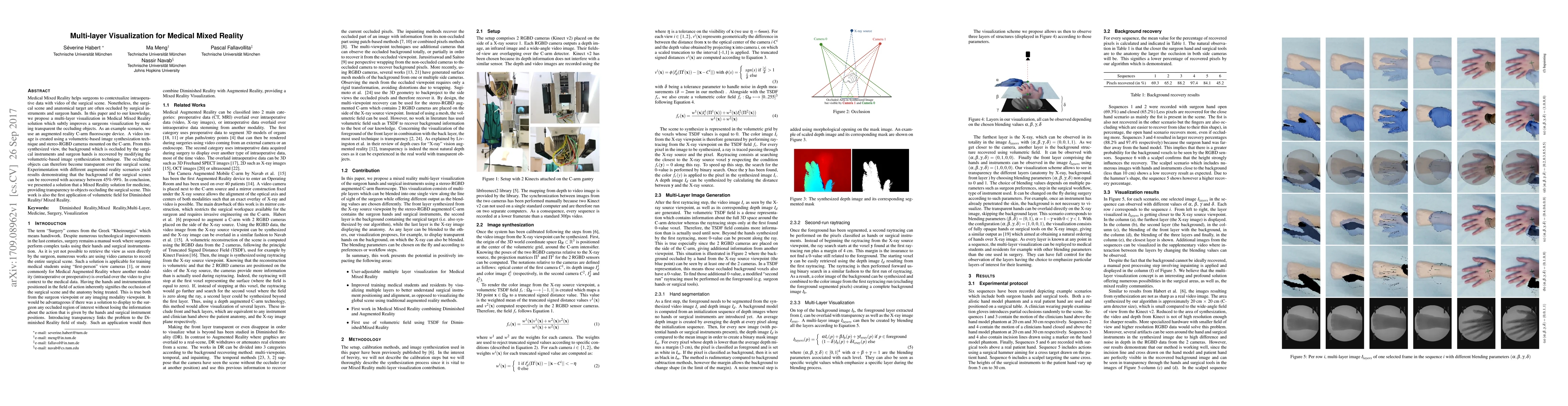 Medical Mixed Reality helps surgeons to contextualize intraoperative data with video of the surgical scene. Nonetheless, the surgical scene and anatomical target are often occluded by surgical instruments and surgeon hands. In this paper and to our knowledge, we propose a multi-layer visualization in Medical Mixed Reality solution which subtly improves a surgeon's visualization by making transparent the occluding objects. As an example scenario, we use an augmented reality C-arm fluoroscope device. A video image is created using a volumetric-based image synthesization technique and stereo-RGBD cameras mounted on the C-arm. From this synthesized view, the background which is occluded by the surgical instruments and surgeon hands is recovered by modifying the volumetric-based image synthesization technique. The occluding objects can, therefore, become transparent over the surgical scene. Experimentation with different augmented reality scenarios yield results demonstrating that the background of the surgical scenes can be recovered with accuracy between 45%-99%. In conclusion, we presented a solution that a Mixed Reality solution for medicine, providing transparency to objects occluding the surgical scene. This work is also the first application of volumetric field for Diminished Reality/ Mixed Reality.