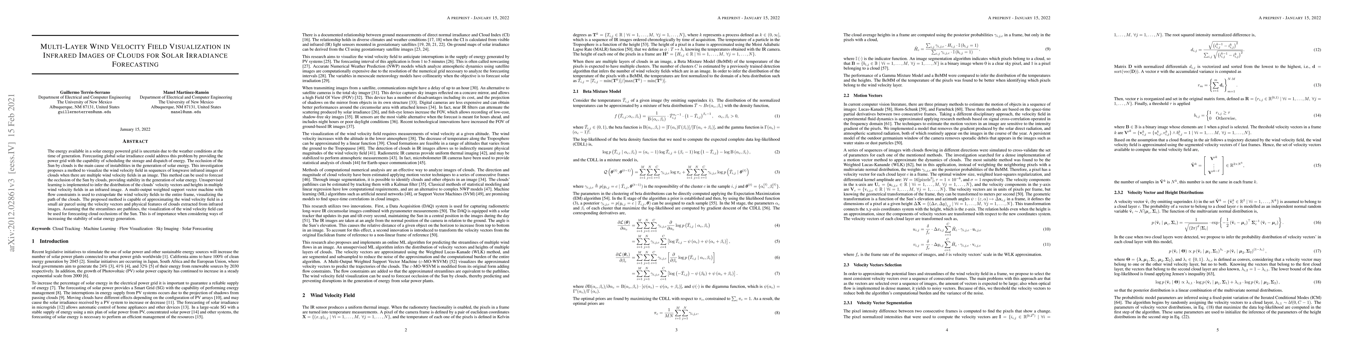 The energy available in a solar energy powered grid is uncertain due to the weather conditions at the time of generation. Forecasting global solar irradiance could address this problem by providing the power grid with the capability of scheduling the storage and dispatch of energy. The occlusion of the Sun by clouds is the main cause of instabilities in the generation of solar energy. This investigation proposes a method to visualize the wind velocity field in sequences of longwave infrared images of clouds when there are multiple wind velocity fields in an image. This method can be used to forecast the occlusion of the Sun by clouds, providing stability in the generation of solar energy. Unsupervised learning is implemented to infer the distribution of the clouds' velocity vectors and heights in multiple wind velocity fields in an infrared image. A multi-output weighted support vector machine with flow constraints is used to extrapolate the wind velocity fields to the entire frame, visualizing the path of the clouds. The proposed method is capable of approximating the wind velocity field in a small air parcel using the velocity vectors and physical features of clouds extracted from infrared images. Assuming that the streamlines are pathlines, the visualization of the wind velocity field can be used for forecasting cloud occlusions of the Sun. This is of importance when considering ways of increasing the stability of solar energy generation.