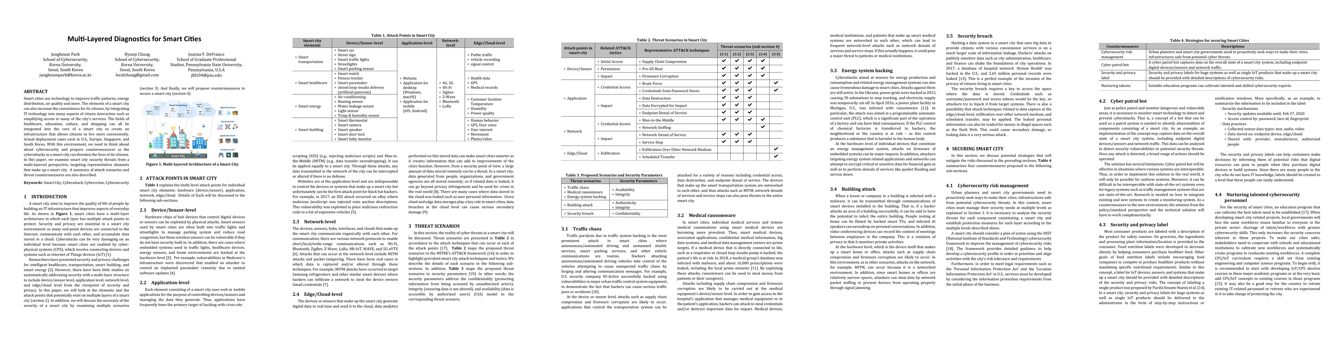 Smart cities use technology to improve traffic patterns, energy distribution, air quality and more. The elements of a smart city can also increase the convenience for its citizens, by integrating IT technology into many aspects of citizen interaction such as simplifying access to many of the city services. The fields of healthcare, education, culture, and shopping can all be integrated into the core of a smart city to create an infrastructure that allows citizens to live more conveniently. Actual deployment cases exist in U.S., Europe, Singapore, and South Korea. With this environment, we need to think ahead about cybersecurity and prepare countermeasures as the cyberattacks in a smart city can threaten the lives of its citizens. In this paper, we examine smart city security threats from a multilayered perspective, targeting representative elements that make up a smart city. A summary of attack scenarios and threat countermeasures are also described.