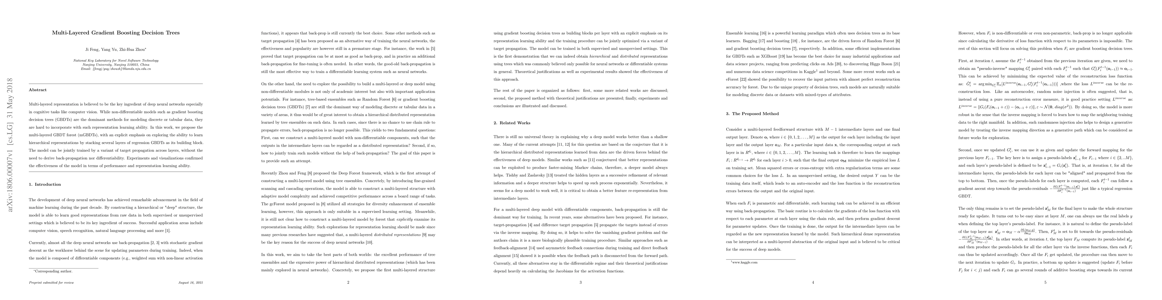 This paper proposes multi-layered GBDT forests (mGBDTs) to incorporate hierarchical representation learning in gradient boosting decision trees, achieving performance improvements without requiring back-propagation. The model is trained via a target propagation method across layers.