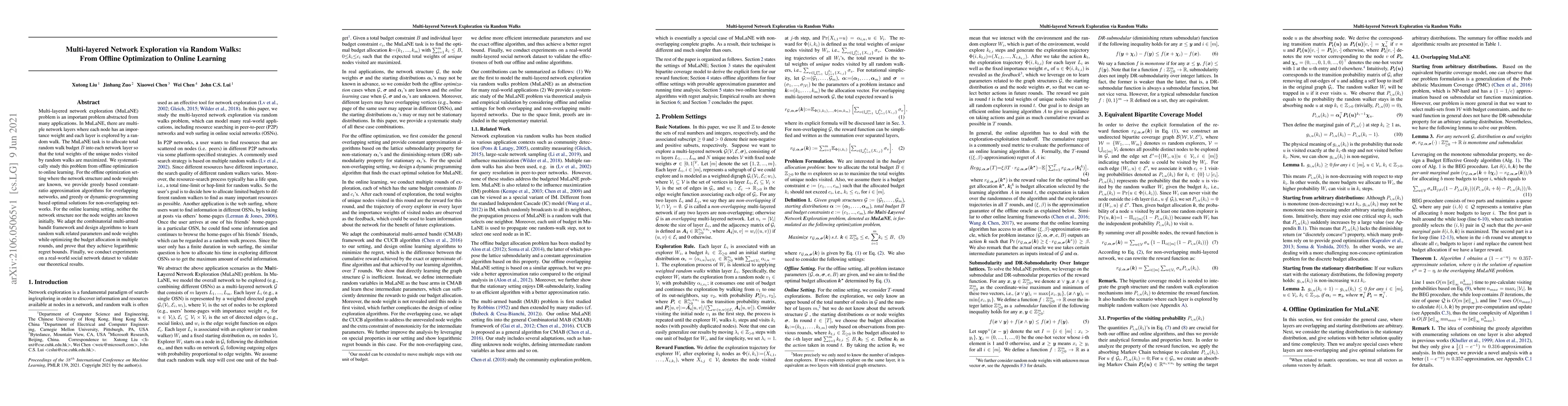 This paper explores the multi-layered network exploration (MuLaNE) problem, proposing algorithms for both offline optimization and online learning to maximize unique node weights visited by random walks. It provides optimal and approximation solutions for known network structures and adaptive algorithms for unknown structures, achieving logarithmic regret bounds.