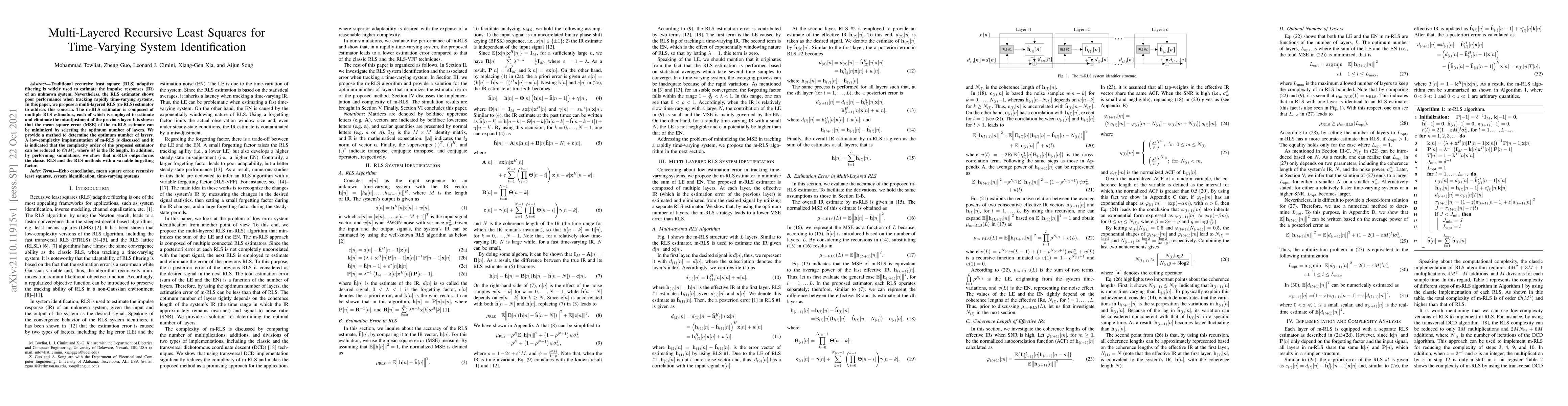 Traditional recursive least square (RLS) adaptive filtering is widely used to estimate the impulse responses (IR) of an unknown system. Nevertheless, the RLS estimator shows poor performance when tracking rapidly time-varying systems. In this paper, we propose a multi-layered RLS (m-RLS) estimator to address this concern. The m-RLS estimator is composed of multiple RLS estimators, each of which is employed to estimate and eliminate the misadjustment of the previous layer. It is shown that the mean square error (MSE) of the m-RLS estimate can be minimized by selecting the optimum number of layers. We provide a method to determine the optimum number of layers. A low-complexity implementation of m-RLS is discussed and it is indicated that the complexity order of the proposed estimator can be reduced to O(M), where M is the IR length. In addition, by performing simulations, we show that m-RLS outperforms the classic RLS and the RLS methods with a variable forgetting factor.