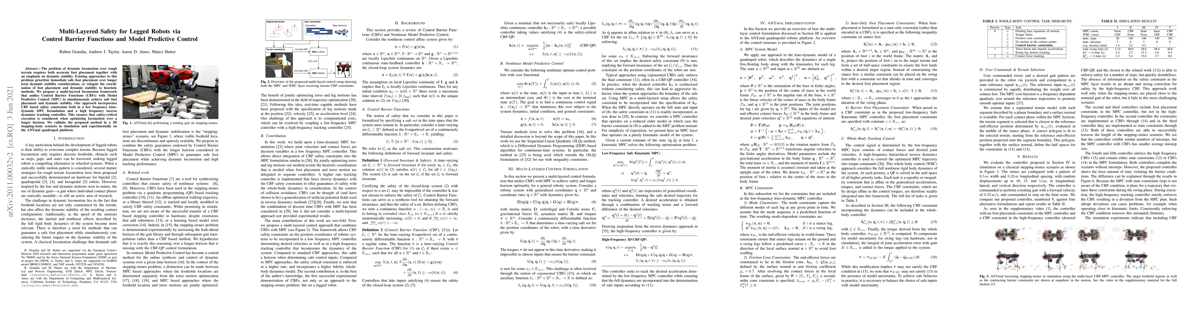 This paper proposes a multi-layered safety framework for legged robots using Control Barrier Functions and Model Predictive Control to achieve both safe foot placement and dynamic stability during locomotion over rough terrain. The approach integrates safety constraints into both long-term and short-term control strategies and is validated through simulation and experiments on a quadruped robot.