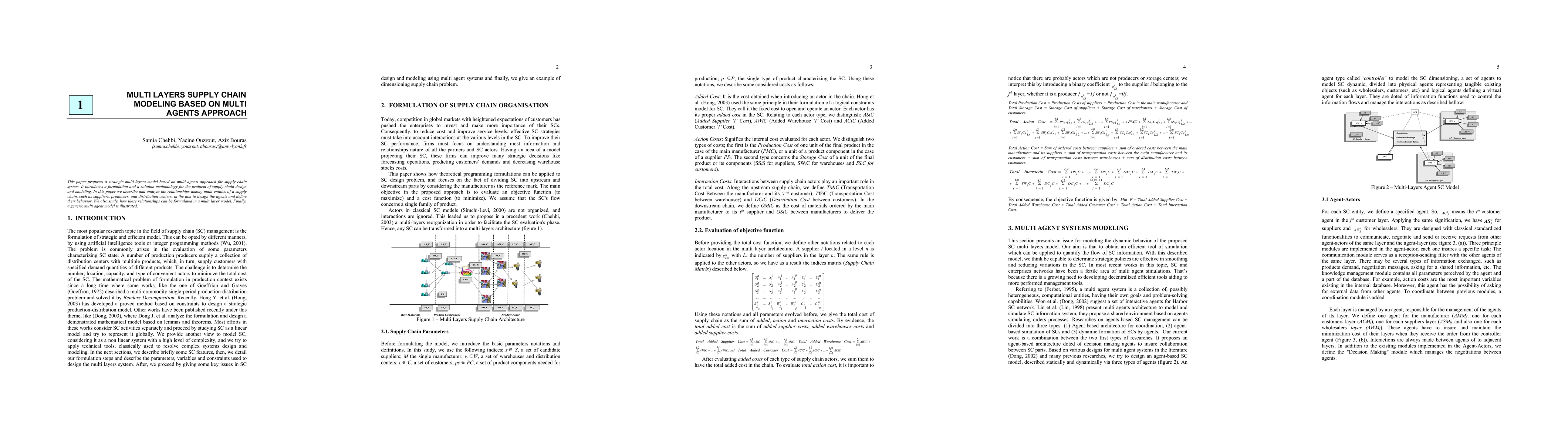 This paper proposes a strategic multi-layer supply chain model using a multi-agent approach to design and optimize supply chain systems. It introduces a formulation and methodology for analyzing relationships among key entities in the supply chain.