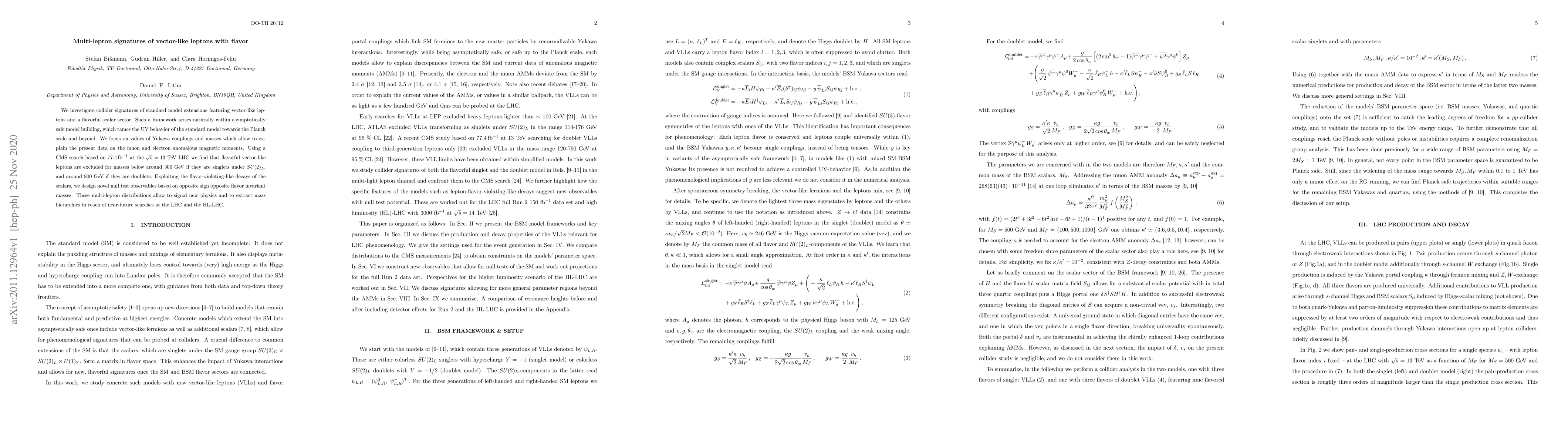 We investigate collider signatures of standard model extensions featuring vector-like leptons and a flavorful scalar sector. Such a framework arises naturally within asymptotically safe model building, which tames the UV behavior of the standard model towards the Planck scale and beyond. We focus on values of Yukawa couplings and masses which allow to explain the present data on the muon and electron anomalous magnetic moments. Using a CMS search based on $77.4 \, \rm{fb}^{-1}$ at the $\sqrt{s}=13$ TeV LHC we find that flavorful vector-like leptons are excluded for masses below around $300$ GeV if they are singlets under $SU(2)_L$, and around $800$ GeV if they are doublets. Exploiting the flavor-violating-like decays of the scalars, we design novel null test observables based on opposite sign opposite flavor invariant masses. These multi-lepton distributions allow to signal new physics and to extract mass hierarchies in reach of near-future searches at the LHC and the HL-LHC.