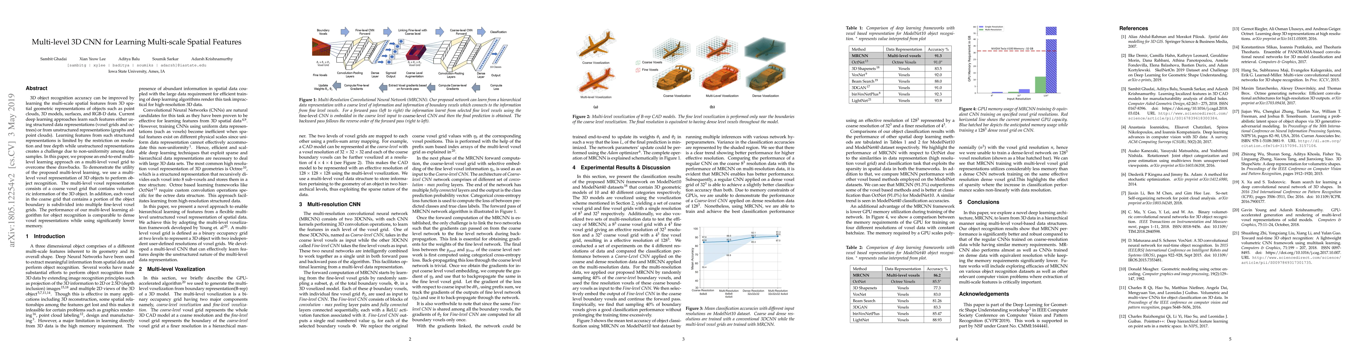 This paper introduces a multi-level 3D CNN approach for 3D object recognition, utilizing a multi-level voxel grid to learn multi-scale spatial features. The method overcomes limitations of structured and unstructured data representations, achieving comparable performance to dense voxel representations with significantly lower memory usage.