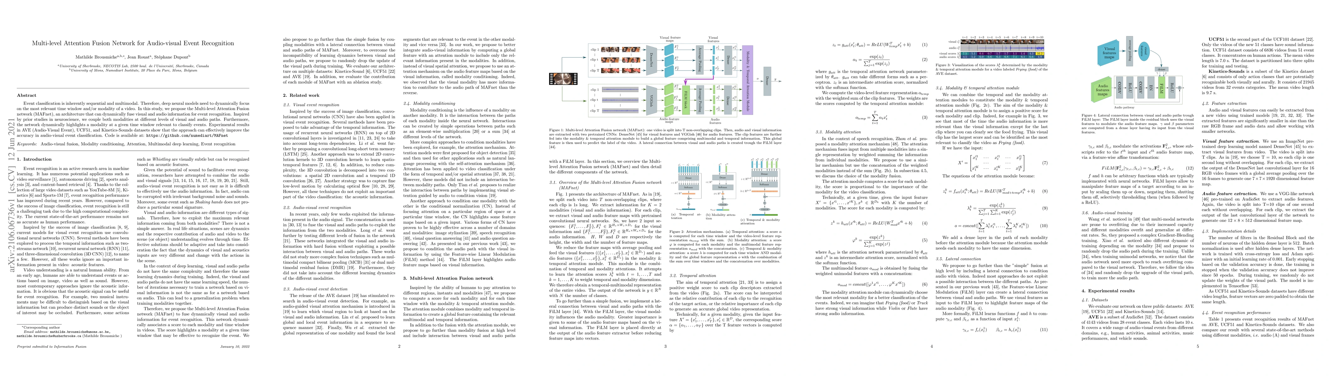 The Multi-level Attention Fusion network (MAFnet) dynamically fuses visual and audio information for improved audio-visual event recognition, achieving higher accuracy on AVE, UCF51, and Kinetics-Sounds datasets. The architecture highlights relevant modalities at specific time windows, inspired by neuroscience.