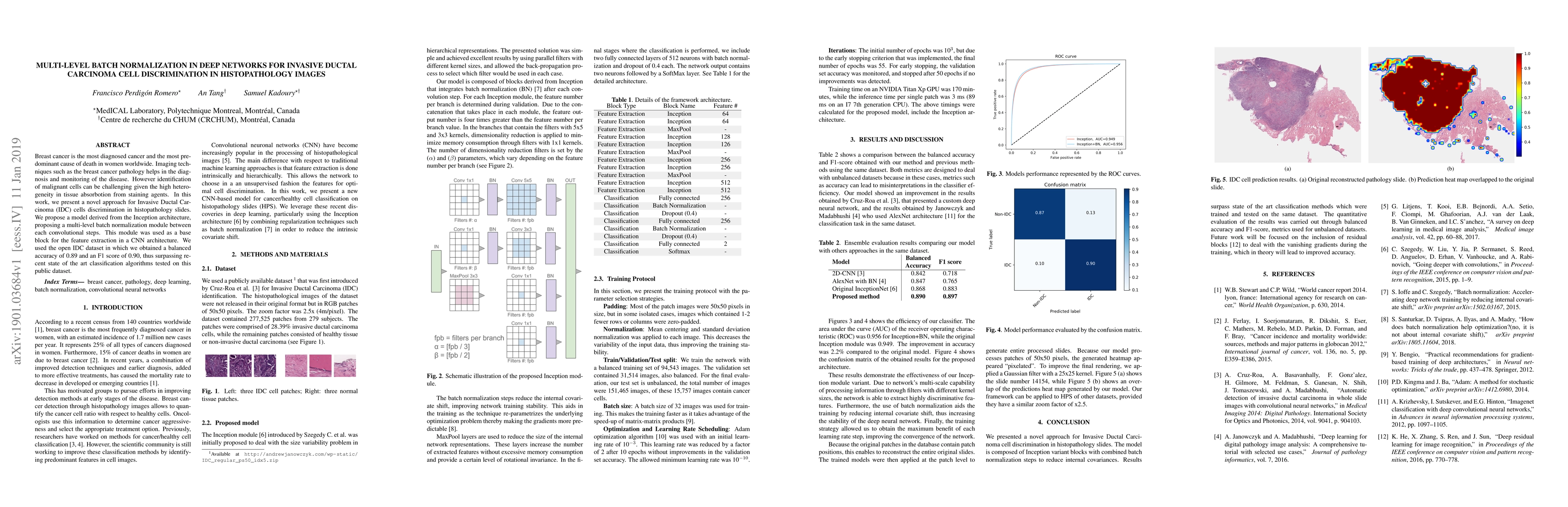 Breast cancer is the most diagnosed cancer and the most predominant cause of death in women worldwide. Imaging techniques such as the breast cancer pathology helps in the diagnosis and monitoring of the disease. However identification of malignant cells can be challenging given the high heterogeneity in tissue absorbotion from staining agents. In this work, we present a novel approach for Invasive Ductal Carcinoma (IDC) cells discrimination in histopathology slides. We propose a model derived from the Inception architecture, proposing a multi-level batch normalization module between each convolutional steps. This module was used as a base block for the feature extraction in a CNN architecture. We used the open IDC dataset in which we obtained a balanced accuracy of 0.89 and an F1 score of 0.90, thus surpassing recent state of the art classification algorithms tested on this public dataset.