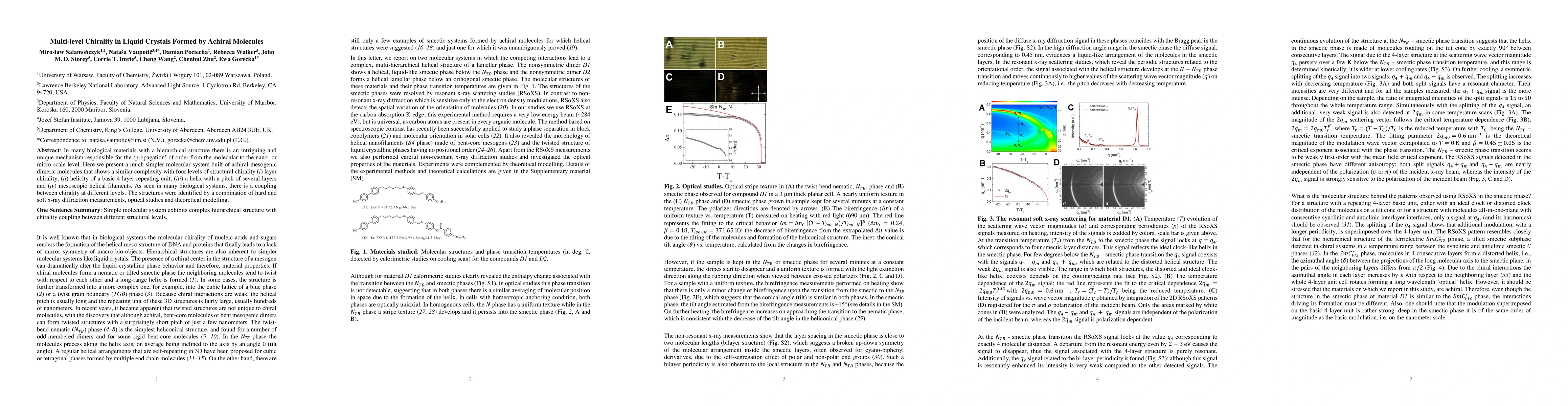 Researchers discovered a liquid crystal system with four levels of structural chirality in achiral molecules, exhibiting similar complexity to biological materials, and used x-ray diffraction, optical studies, and theoretical modeling to identify its structures.
