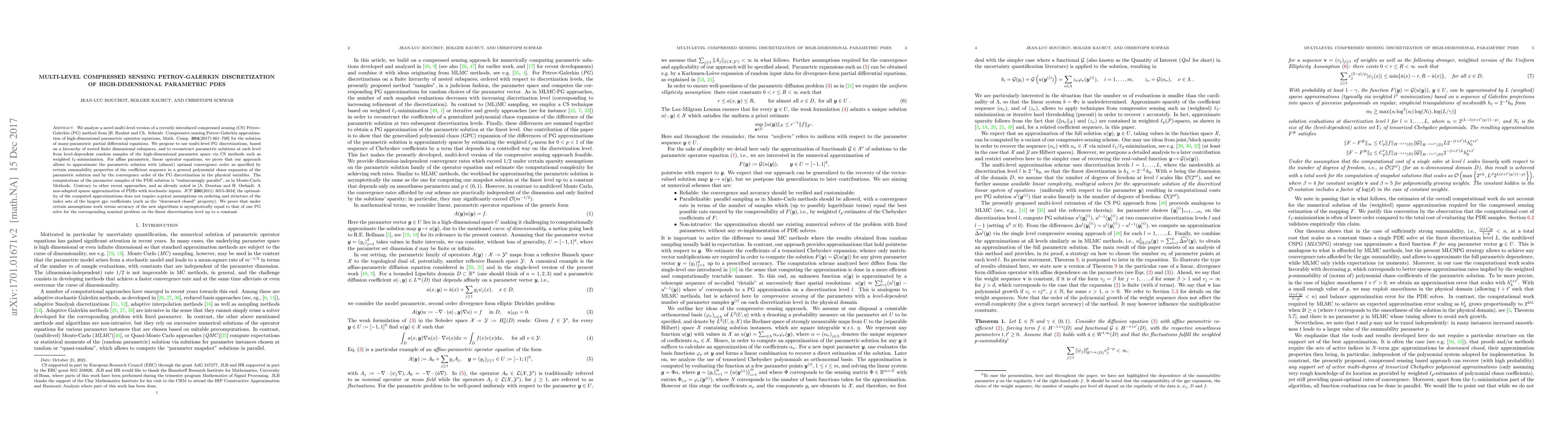 We analyze a novel multi-level version of a recently introduced compressed sensing (CS) Petrov-Galerkin (PG) method from [H. Rauhut and Ch. Schwab: Compressive Sensing Petrov-Galerkin approximation of high-dimensional parametric operator equations, Math. Comp. 304(2017) 661-700] for the solution of many-parametric partial differential equations. We propose to use multi-level PG discretizations, based on a hierarchy of nested finite dimensional subspaces, and to reconstruct parametric solutions at each level from level-dependent random samples of the high-dimensional parameter space via CS methods such as weighted l1-minimization. For affine parametric, linear operator equations, we prove that our approach allows to approximate the parametric solution with (almost) optimal convergence order as specified by certain summability properties of the coefficient sequence in a general polynomial chaos expansion of the parametric solution and by the convergence order of the PG discretization in the physical variables. The computations of the parameter samples of the PDE solution is "embarrassingly parallel", as in Monte-Carlo Methods. Contrary to other recent approaches, and as already noted in [A. Doostan and H. Owhadi: A non-adapted sparse approximation of PDEs with stochastic inputs. JCP 230(2011) 3015-3034] the optimality of the computed approximations does not require a-priori assumptions on ordering and structure of the index sets of the largest gpc coefficients (such as the "downward closed" property). We prove that under certain assumptions work versus accuracy of the new algorithms is asymptotically equal to that of one PG solve for the corresponding nominal problem on the finest discretization level up to a constant.