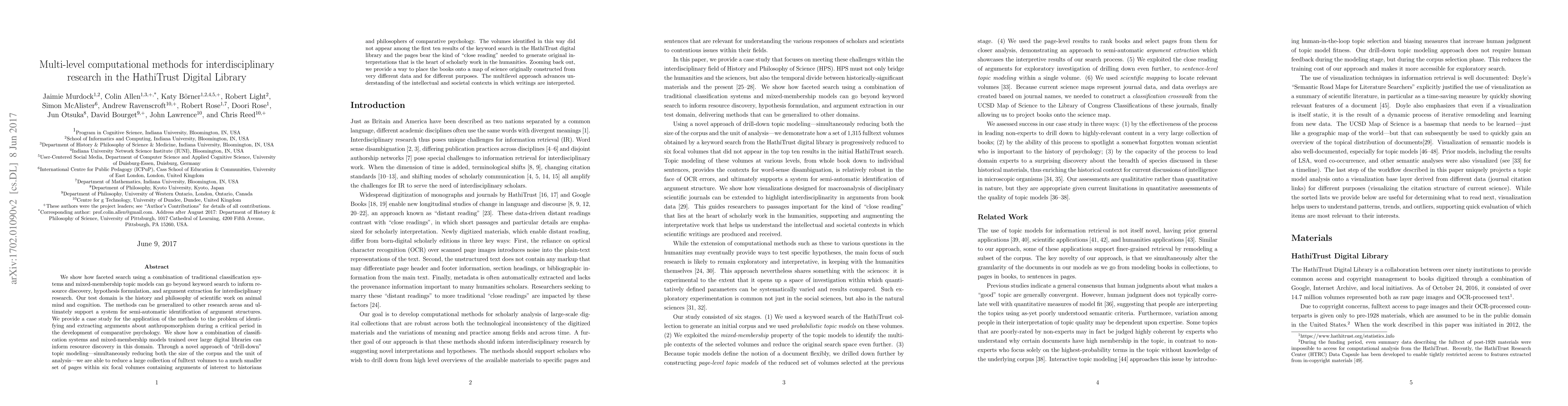 We show how faceted search using a combination of traditional classification systems and mixed-membership topic models can go beyond keyword search to inform resource discovery, hypothesis formulation, and argument extraction for interdisciplinary research. Our test domain is the history and philosophy of scientific work on animal mind and cognition. The methods can be generalized to other research areas and ultimately support a system for semi-automatic identification of argument structures. We provide a case study for the application of the methods to the problem of identifying and extracting arguments about anthropomorphism during a critical period in the development of comparative psychology. We show how a combination of classification systems and mixed-membership models trained over large digital libraries can inform resource discovery in this domain. Through a novel approach of "drill-down" topic modeling---simultaneously reducing both the size of the corpus and the unit of analysis---we are able to reduce a large collection of fulltext volumes to a much smaller set of pages within six focal volumes containing arguments of interest to historians and philosophers of comparative psychology. The volumes identified in this way did not appear among the first ten results of the keyword search in the HathiTrust digital library and the pages bear the kind of "close reading" needed to generate original interpretations that is the heart of scholarly work in the humanities. Zooming back out, we provide a way to place the books onto a map of science originally constructed from very different data and for different purposes. The multilevel approach advances understanding of the intellectual and societal contexts in which writings are interpreted.