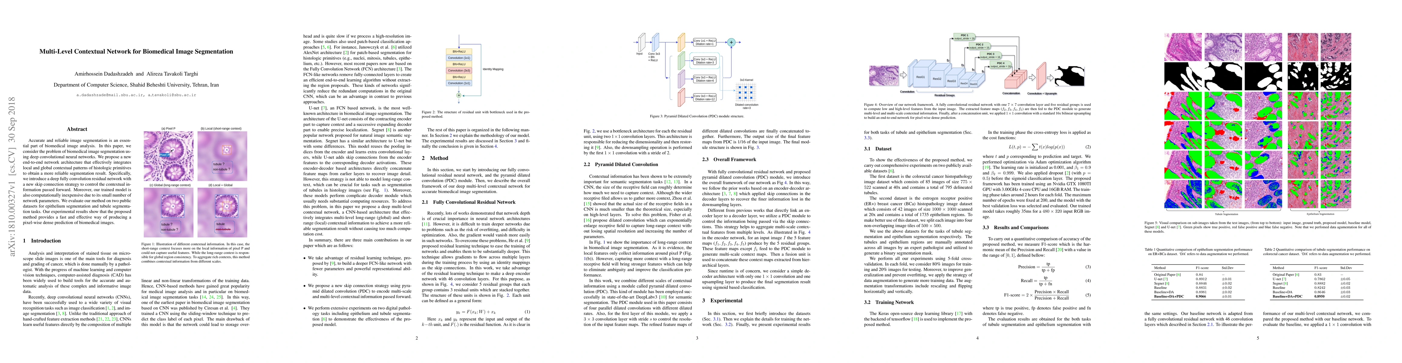 This paper proposes a multi-level contextual network for biomedical image segmentation using deep convolutional neural networks, integrating local and global patterns for reliable results. The model employs a small, efficient residual network with a novel skip connection strategy, demonstrating effective and fast segmentation on epithelial and tubule datasets.