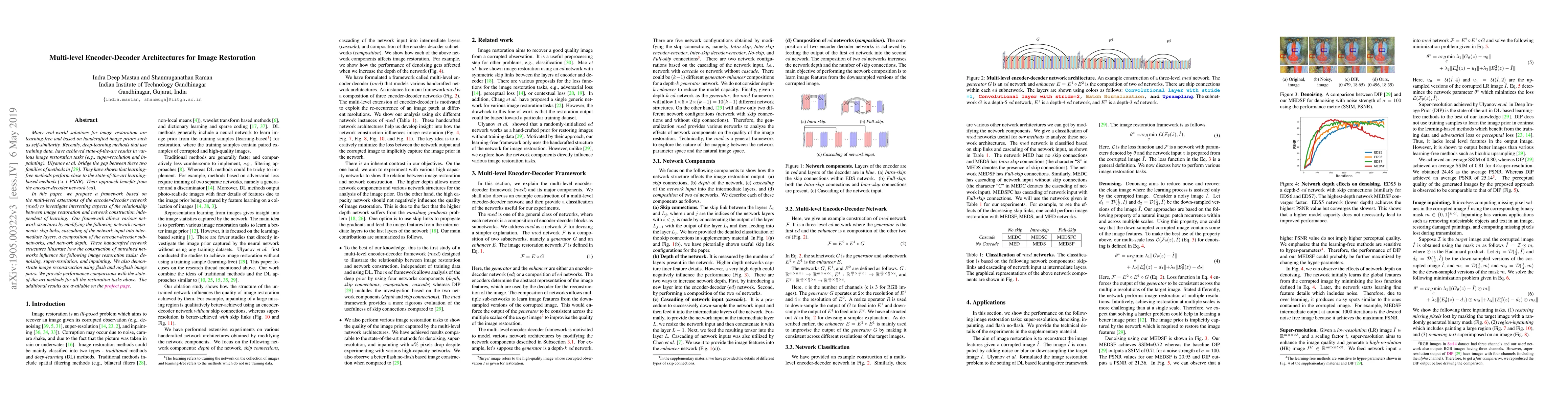 This paper proposes a framework based on multi-level encoder-decoder architectures for various image restoration tasks, including denoising, super-resolution, and inpainting, without relying on training data. It explores how different network structures, such as skip links and network depth, influence performance, comparing results to the state-of-the-art methods.