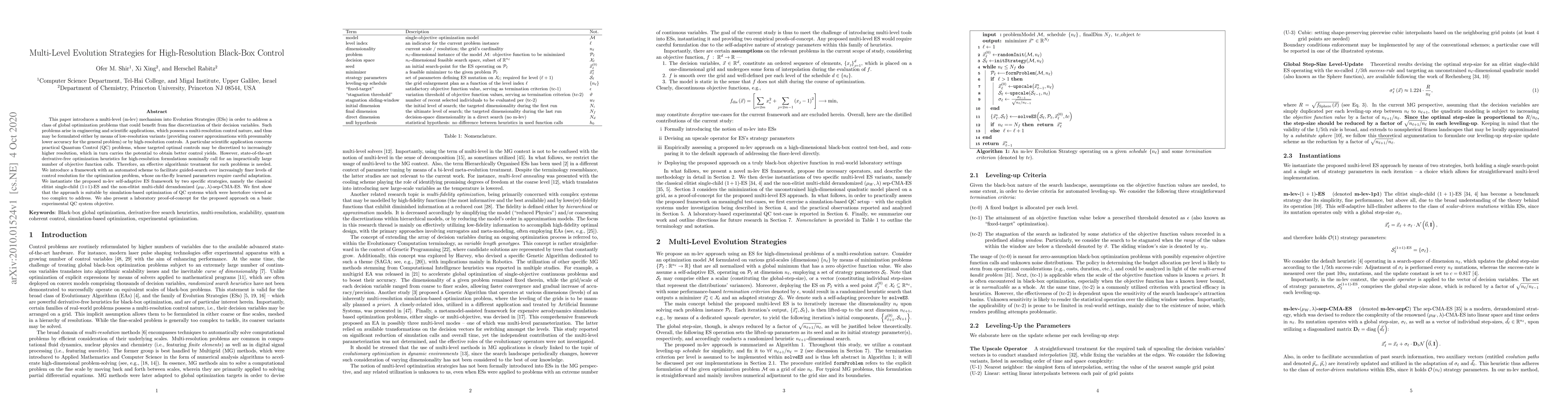 This paper introduces a multi-level (m-lev) mechanism into Evolution Strategies (ESs) in order to address a class of global optimization problems that could benefit from fine discretization of their decision variables. Such problems arise in engineering and scientific applications, which possess a multi-resolution control nature, and thus may be formulated either by means of low-resolution variants (providing coarser approximations with presumably lower accuracy for the general problem) or by high-resolution controls. A particular scientific application concerns practical Quantum Control (QC) problems, whose targeted optimal controls may be discretized to increasingly higher resolution, which in turn carries the potential to obtain better control yields. However, state-of-the-art derivative-free optimization heuristics for high-resolution formulations nominally call for an impractically large number of objective function calls. Therefore, an effective algorithmic treatment for such problems is needed. We introduce a framework with an automated scheme to facilitate guided-search over increasingly finer levels of control resolution for the optimization problem, whose on-the-fly learned parameters require careful adaptation. We instantiate the proposed m-lev self-adaptive ES framework by two specific strategies, namely the classical elitist single-child (1+1)-ES and the non-elitist multi-child derandomized $(\mu_W,\lambda)$-sep-CMA-ES. We first show that the approach is suitable by simulation-based optimization of QC systems which were heretofore viewed as too complex to address. We also present a laboratory proof-of-concept for the proposed approach on a basic experimental QC system objective.