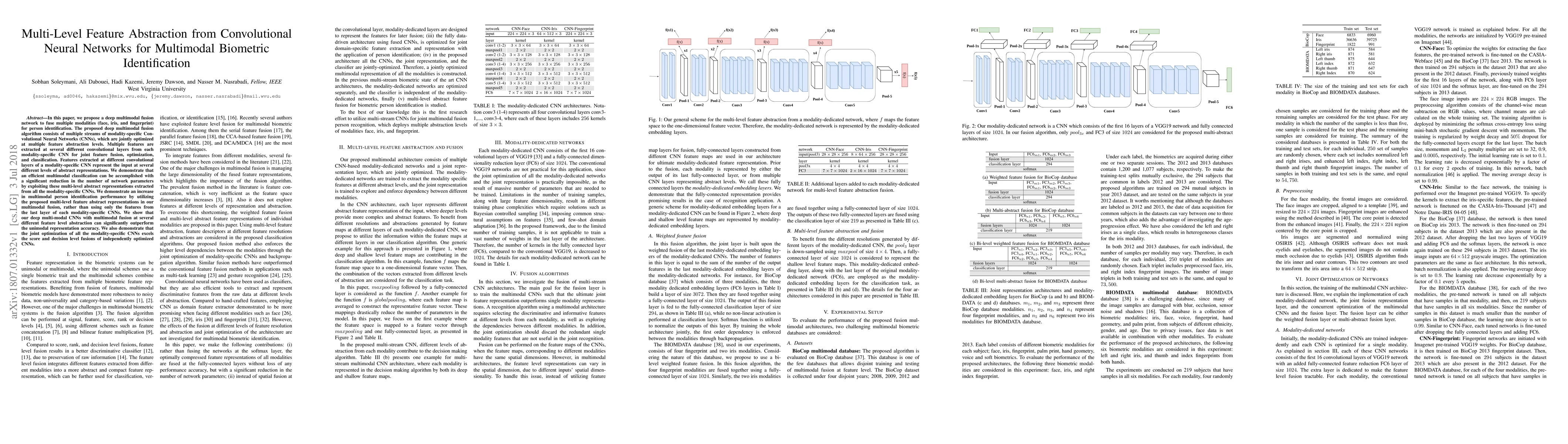 In this paper, we propose a deep multimodal fusion network to fuse multiple modalities (face, iris, and fingerprint) for person identification. The proposed deep multimodal fusion algorithm consists of multiple streams of modality-specific Convolutional Neural Networks (CNNs), which are jointly optimized at multiple feature abstraction levels. Multiple features are extracted at several different convolutional layers from each modality-specific CNN for joint feature fusion, optimization, and classification. Features extracted at different convolutional layers of a modality-specific CNN represent the input at several different levels of abstract representations. We demonstrate that an efficient multimodal classification can be accomplished with a significant reduction in the number of network parameters by exploiting these multi-level abstract representations extracted from all the modality-specific CNNs. We demonstrate an increase in multimodal person identification performance by utilizing the proposed multi-level feature abstract representations in our multimodal fusion, rather than using only the features from the last layer of each modality-specific CNNs. We show that our deep multi-modal CNNs with multimodal fusion at several different feature level abstraction can significantly outperform the unimodal representation accuracy. We also demonstrate that the joint optimization of all the modality-specific CNNs excels the score and decision level fusions of independently optimized CNNs.