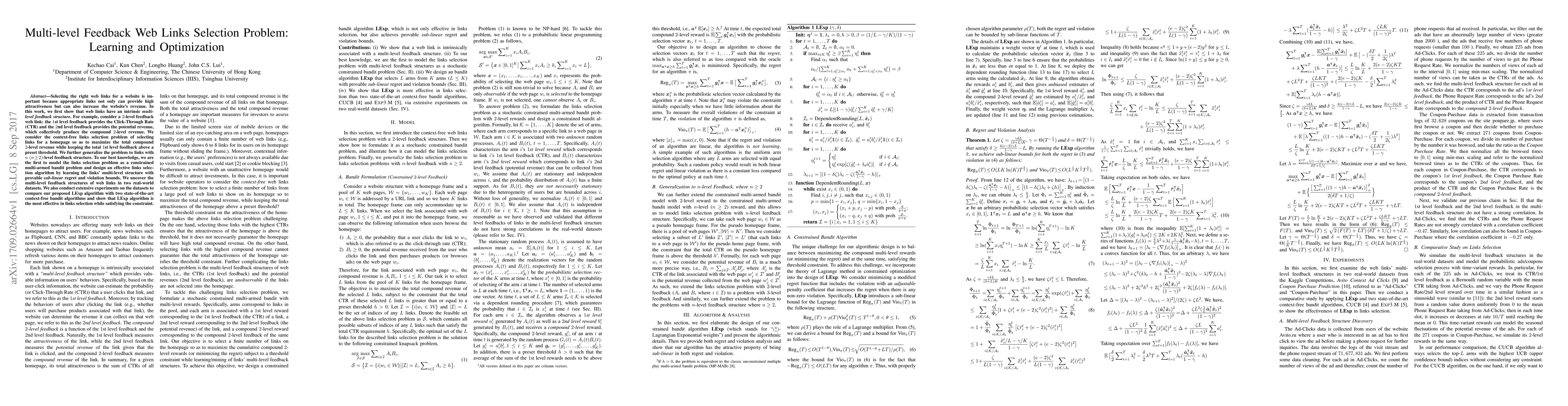 Selecting the right web links for a website is important because appropriate links not only can provide high attractiveness but can also increase the website's revenue. In this work, we first show that web links have an intrinsic \emph{multi-level feedback structure}. For example, consider a $2$-level feedback web link: the $1$st level feedback provides the Click-Through Rate (CTR) and the $2$nd level feedback provides the potential revenue, which collectively produce the compound $2$-level revenue. We consider the context-free links selection problem of selecting links for a homepage so as to maximize the total compound $2$-level revenue while keeping the total $1$st level feedback above a preset threshold. We further generalize the problem to links with $n~(n\ge2)$-level feedback structure. The key challenge is that the links' multi-level feedback structures are unobservable unless the links are selected on the homepage. To our best knowledge, we are the first to model the links selection problem as a constrained multi-armed bandit problem and design an effective links selection algorithm by learning the links' multi-level structure with provable \emph{sub-linear} regret and violation bounds. We uncover the multi-level feedback structures of web links in two real-world datasets. We also conduct extensive experiments on the datasets to compare our proposed \textbf{LExp} algorithm with two state-of-the-art context-free bandit algorithms and show that \textbf{LExp} algorithm is the most effective in links selection while satisfying the constraint.