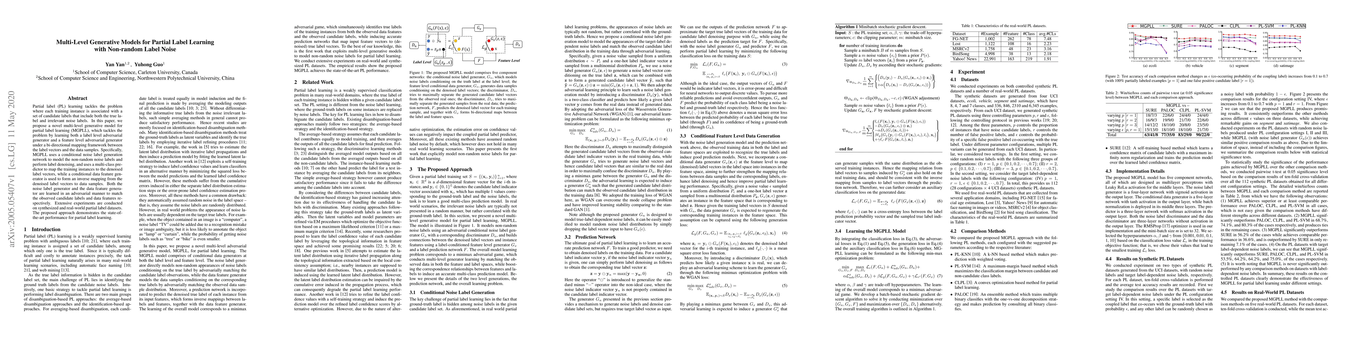 This paper introduces a multi-level generative model for partial label learning that addresses non-random label noise by using adversarial generators at both label and feature levels. The model demonstrates state-of-the-art performance on both synthesized and real-world datasets.