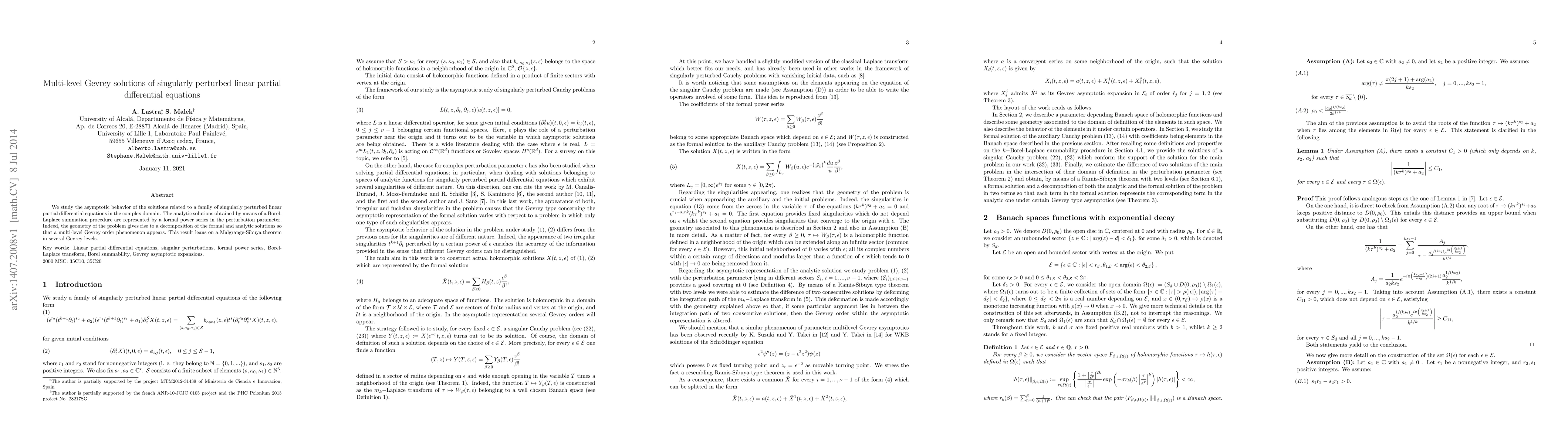 This paper investigates the asymptotic behavior of solutions to singularly perturbed linear partial differential equations using a Borel-Laplace summation procedure, revealing a multi-level Gevrey order phenomenon based on the geometry of the problem and supported by a Malgrange-Sibuya theorem.