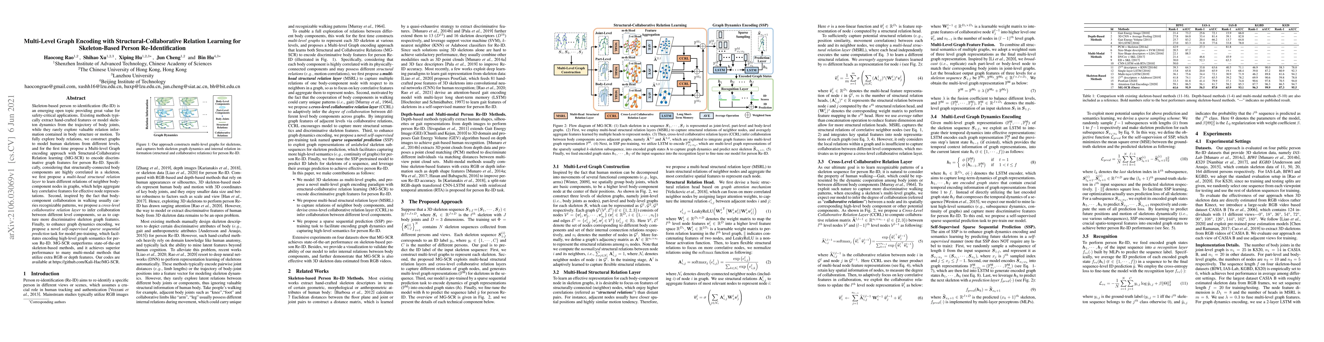 This paper proposes a Multi-Level Graph encoding approach with Structural-Collaborative Relation learning (MG-SCR) for skeleton-based person re-identification, utilizing multi-head structural and cross-level collaborative relation layers to capture discriminative features from human skeleton graphs. The method outperforms state-of-the-art skeleton-based and multi-modal methods.