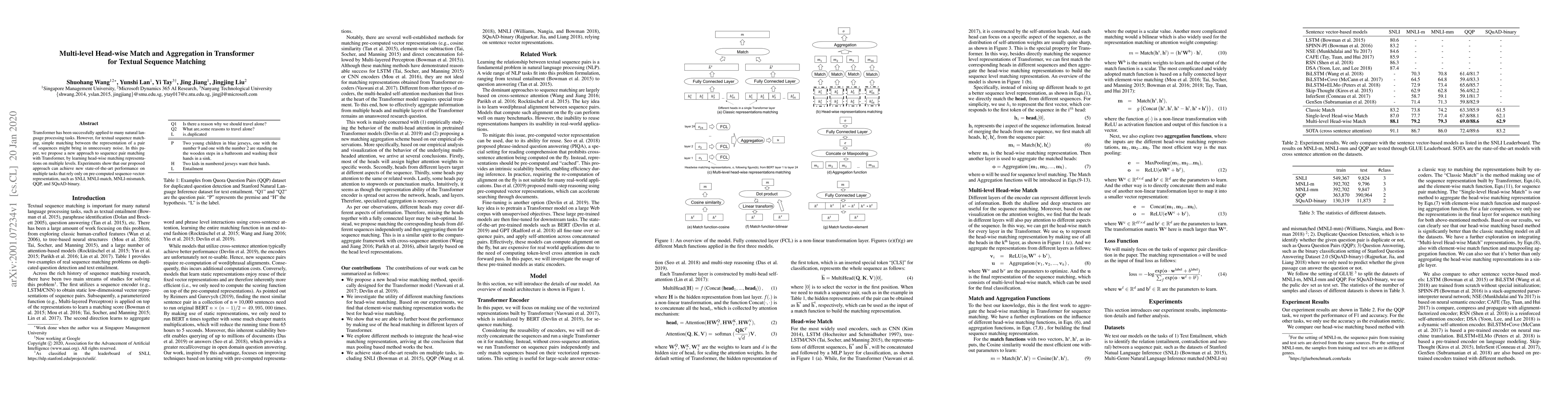 The paper introduces a novel method for textual sequence matching using Transformer, which learns head-wise matching representations on multiple levels to reduce unnecessary noise. This approach achieves state-of-the-art performance on various tasks including SNLI, MNLI-match, MNLI-mismatch, QQP, and SQuAD-binary.