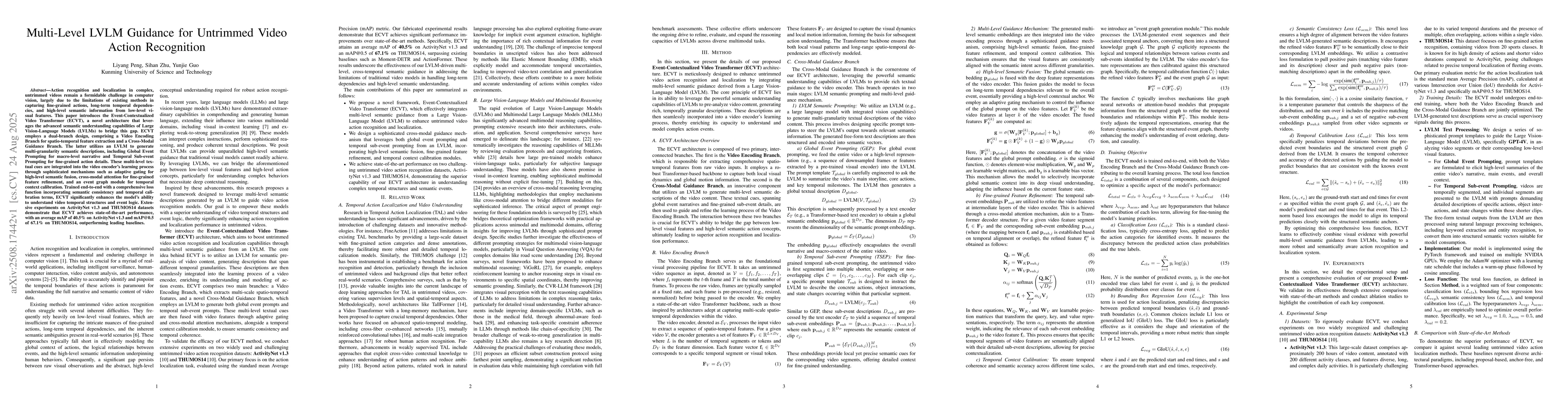 Action recognition and localization in complex, untrimmed videos remain a formidable challenge in computer vision, largely due to the limitations of existing methods in capturing fine-grained actions, long-term temporal dependencies, and high-level semantic information from low-level visual features. This paper introduces the Event-Contextualized Video Transformer (ECVT), a novel architecture that leverages the advanced semantic understanding capabilities of Large Vision-Language Models (LVLMs) to bridge this gap. ECVT employs a dual-branch design, comprising a Video Encoding Branch for spatio-temporal feature extraction and a Cross-Modal Guidance Branch. The latter utilizes an LVLM to generate multi-granularity semantic descriptions, including Global Event Prompting for macro-level narrative and Temporal Sub-event Prompting for fine-grained action details. These multi-level textual cues are integrated into the video encoder's learning process through sophisticated mechanisms such as adaptive gating for high-level semantic fusion, cross-modal attention for fine-grained feature refinement, and an event graph module for temporal context calibration. Trained end-to-end with a comprehensive loss function incorporating semantic consistency and temporal calibration terms, ECVT significantly enhances the model's ability to understand video temporal structures and event logic. Extensive experiments on ActivityNet v1.3 and THUMOS14 datasets demonstrate that ECVT achieves state-of-the-art performance, with an average mAP of 40.5% on ActivityNet v1.3 and [email protected] of 67.1% on THUMOS14, outperforming leading baselines.