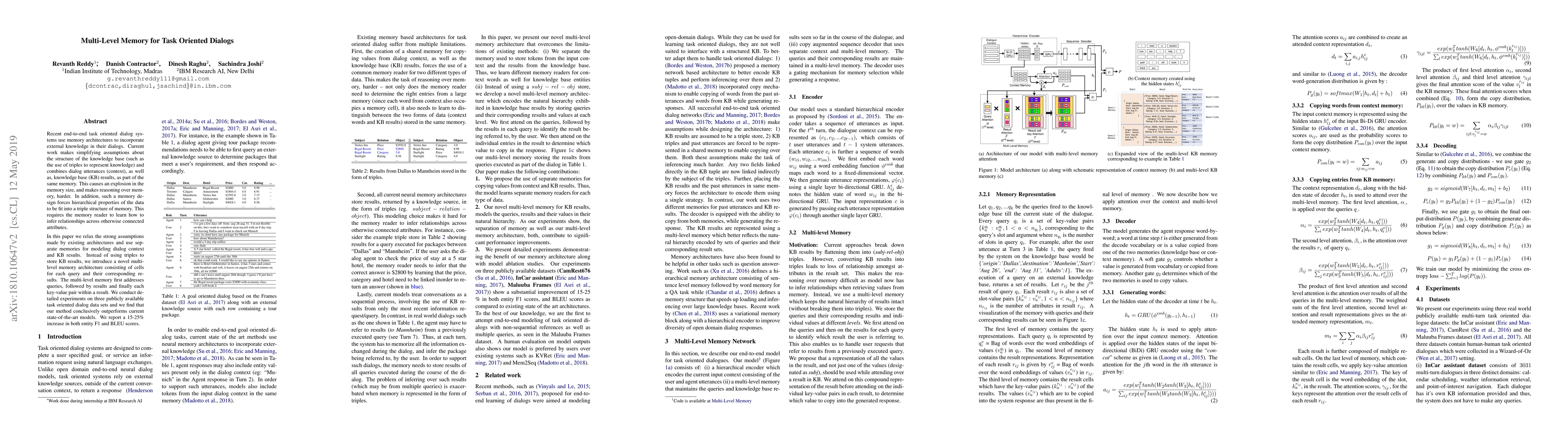 This paper proposes a novel multi-level memory architecture to improve task-oriented dialog systems by separating dialog context and knowledge base results. The new design reduces memory size and enhances reasoning, leading to a 15-25% improvement in entity F1 and BLEU scores over existing models.