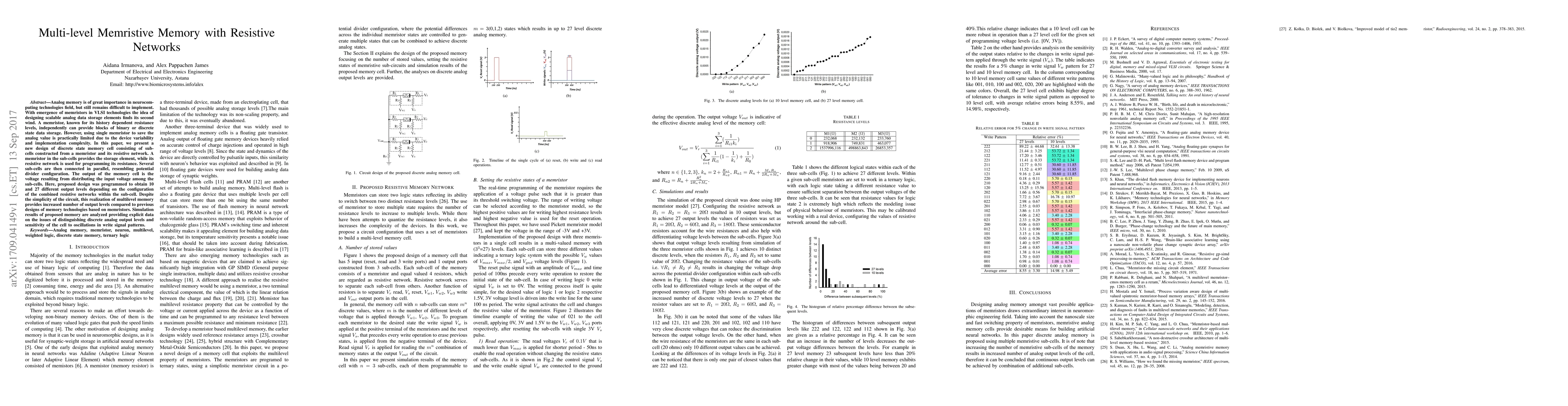 Analog memory is of great importance in neurocomputing technologies field, but still remains difficult to implement. With emergence of memristors in VLSI technologies the idea of designing scalable analog data storage elements finds its second wind. A memristor, known for its history dependent resistance levels, independently can provide blocks of binary or discrete state data storage. However, using single memristor to save the analog value is practically limited due to the device variability and implementation complexity. In this paper, we present a new design of discrete state memory cell consisting of subcells constructed from a memristor and its resistive network. A memristor in the sub-cells provides the storage element, while its resistive network is used for programming its resistance. Several sub-cells are then connected in parallel, resembling potential divider configuration. The output of the memory cell is the voltage resulting from distributing the input voltage among the sub-cells. Here, proposed design was programmed to obtain 10 and 27 different output levels depending on the configuration of the combined resistive networks within the sub-cell. Despite the simplicity of the circuit, this realization of multilevel memory provides increased number of output levels compared to previous designs of memory technologies based on memristors. Simulation results of proposed memory are analyzed providing explicit data on the issues of distinguishing discrete analog output levels and sensitivity of the cell to oscillations in write signal patterns.