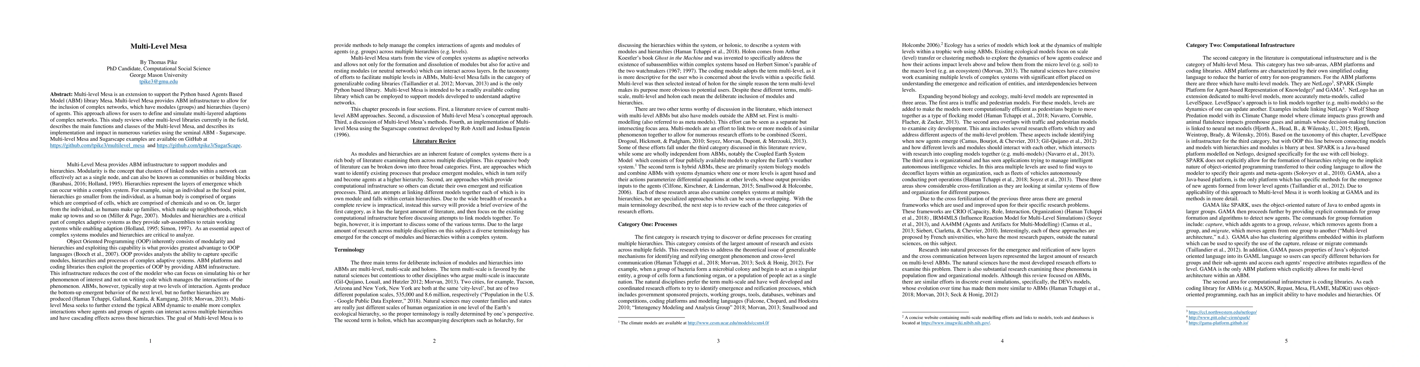 Multi-level Mesa, an extension to Mesa ABM library, supports complex networks with modules (groups) and hierarchies (layers) of agents. It was validated using the Sugarscape model, a seminal ABM demonstrating bottom-up emergence of system behavior.