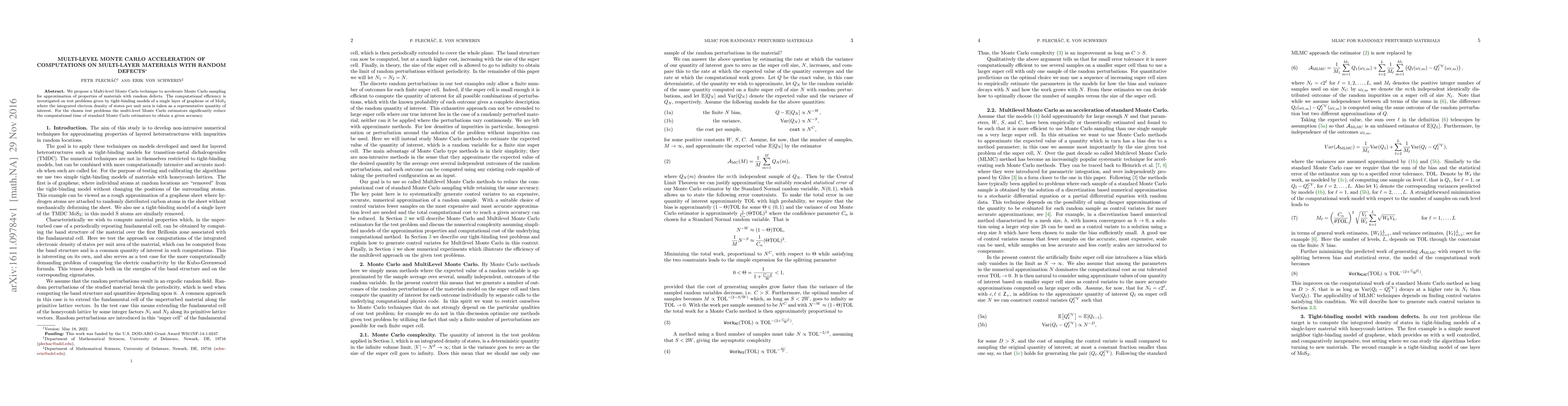 We propose a Multi-level Monte Carlo technique to accelerate Monte Carlo sampling for approximation of properties of materials with random defects. The computational efficiency is investigated on test problems given by tight-binding models of a single layer of graphene or of $MoS_2$ where the integrated electron density of states per unit area is taken as a representative quantity of interest. For the chosen test problems the multi-level Monte Carlo estimators significantly reduce the computational time of standard Monte Carlo estimators to obtain a given accuracy.
