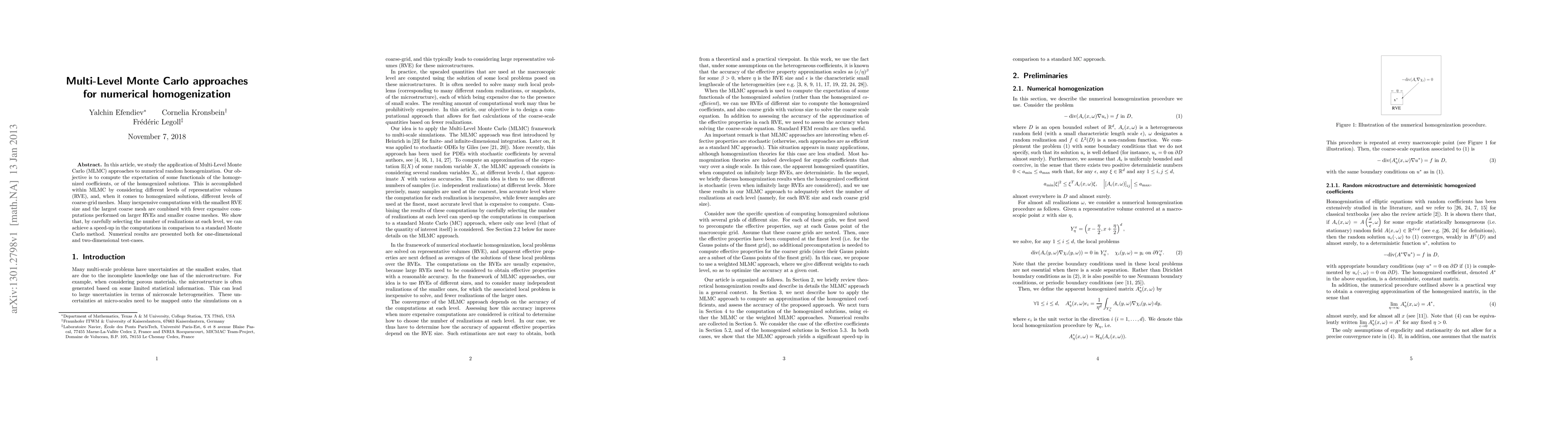 This paper explores Multi-Level Monte Carlo (MLMC) methods for numerical random homogenization, achieving faster computation through a combination of inexpensive and expensive simulations at different levels of representative volumes and coarse-grid meshes. Numerical results demonstrate improved efficiency compared to standard Monte Carlo methods.